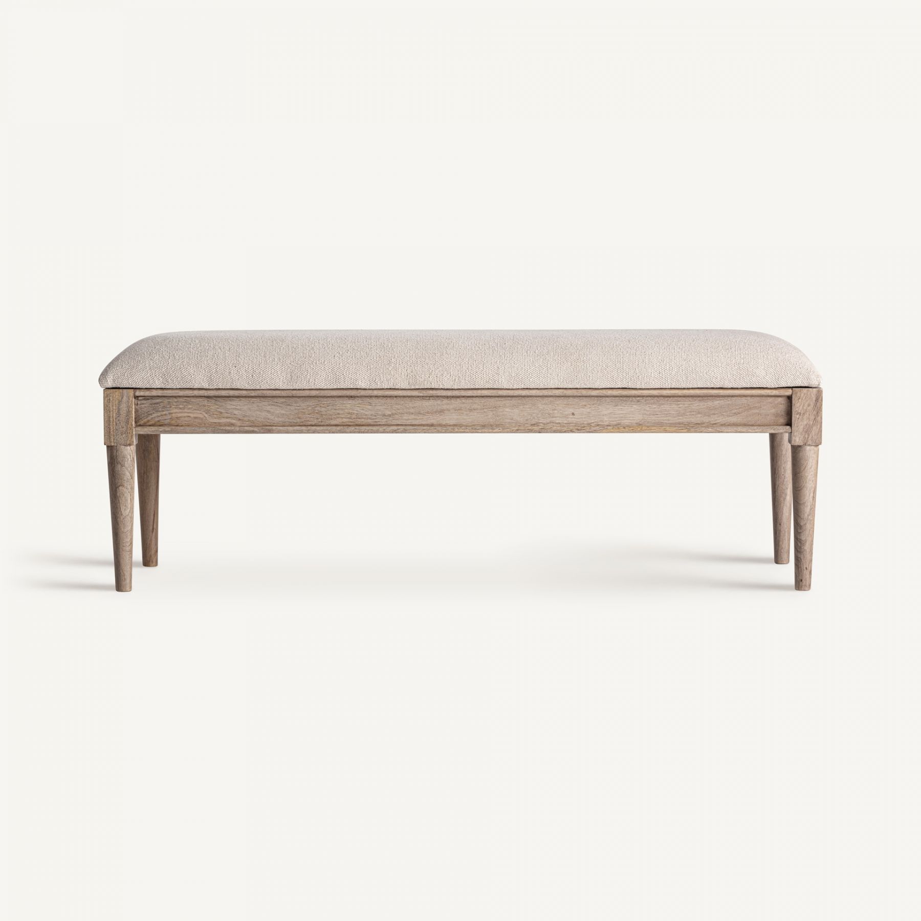 Скамейка изготовлена из светло-коричневого мангового дерева в сочетании с бежевым джутом и пенопластом. Ширина: 130 см, Глубина: 40 см, Высота: 45 см