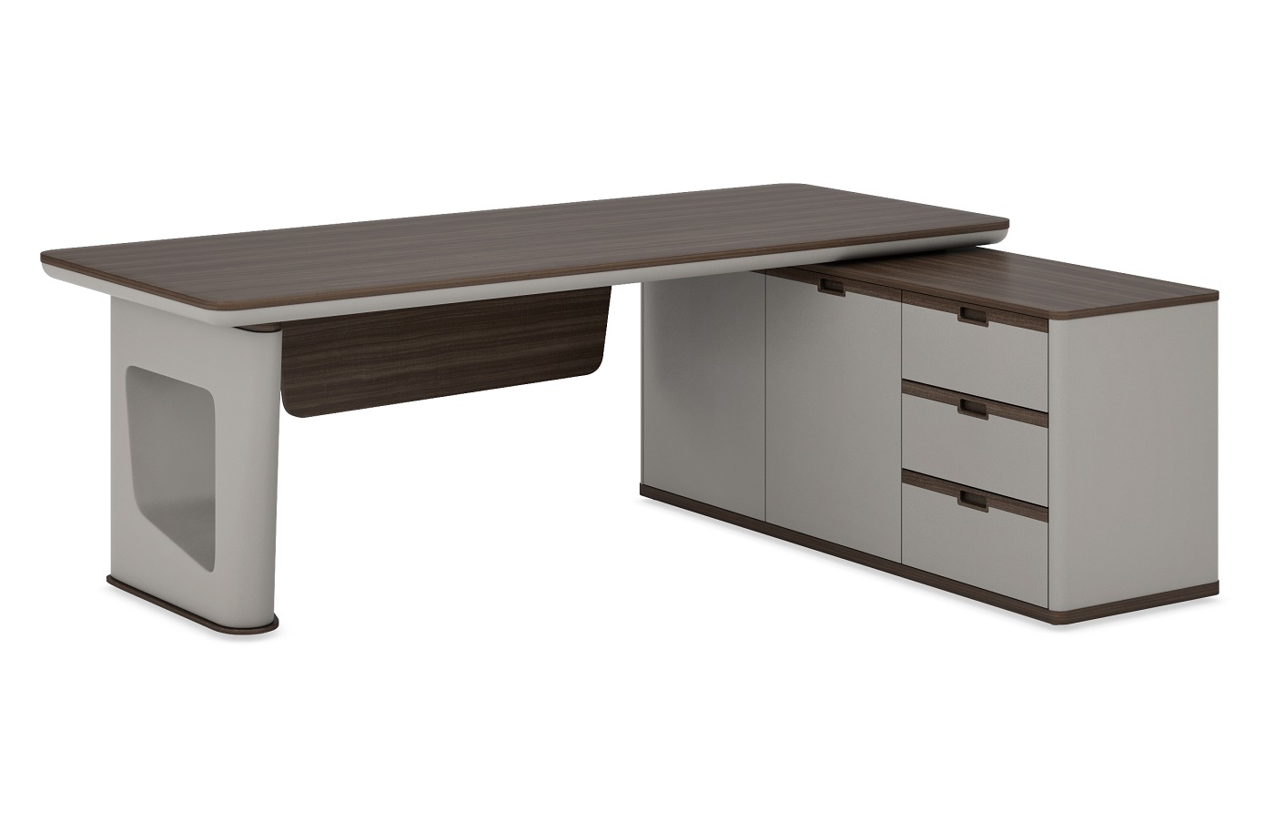 Массивный, с безукоризненной обработкой стол руководителя отделан элитный кожей и дорогими породами редкого дерева мореный Эвкалипт. Этот теплый цвет одновременно придает таинственность и современность коллекции мебели для руководителя Avatar.