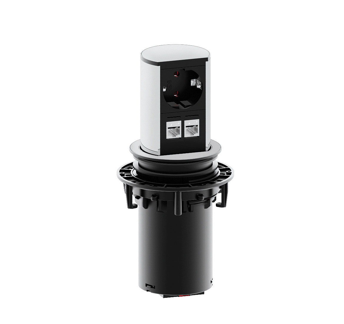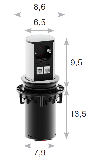 Розеточный блок Elevator представлен 1 силовой розеткой и 2 сетевыми входами RJ45 (Cat5e).