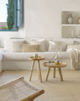Кофейный столик Glenda La Forma (ex Julia Grup) – показательная красота древесины в деревенском эко-дизайне. Столик Glenda с первого взгляда очаровывает своим самобытным видом. Созданный из натурального дерева, он будет прекрасно гармонировать с любым интерьером, добавит в него уют и ощущение домашнего комфорта. А наличие бортиков не позволит пролитому бокалу вина оказаться на любимом ковре. И присмотритесь внимательнее – рисунок древесины прекрасен и уникален! Журнальный столик Glenda изготовлен из переработанного массива тика. Это не только экологичный, но и износостойкий материал с защитным покрытием. Поэтому изделие можно использовать на улице, не переживая, что оно испортится. Уникальная тональность зерен и вершин дерева делает каждый стол неповторимым, и это также является его ценностью. Ножки имеют круглую форму, симметрично расходятся из центра, что обеспечивает равномерное распределение нагрузки. В коллекции представлено два столика с разными размерами. Размеры: ширина – 55 или 57 см, высота – 31 или 33 см, глубина – 55 или 57 см. Вес изделия – 2,6 или 3,8 кг. Изделие поставляется в собранном виде. Только деликатная чистка, без использования отбеливателей и абразивов.