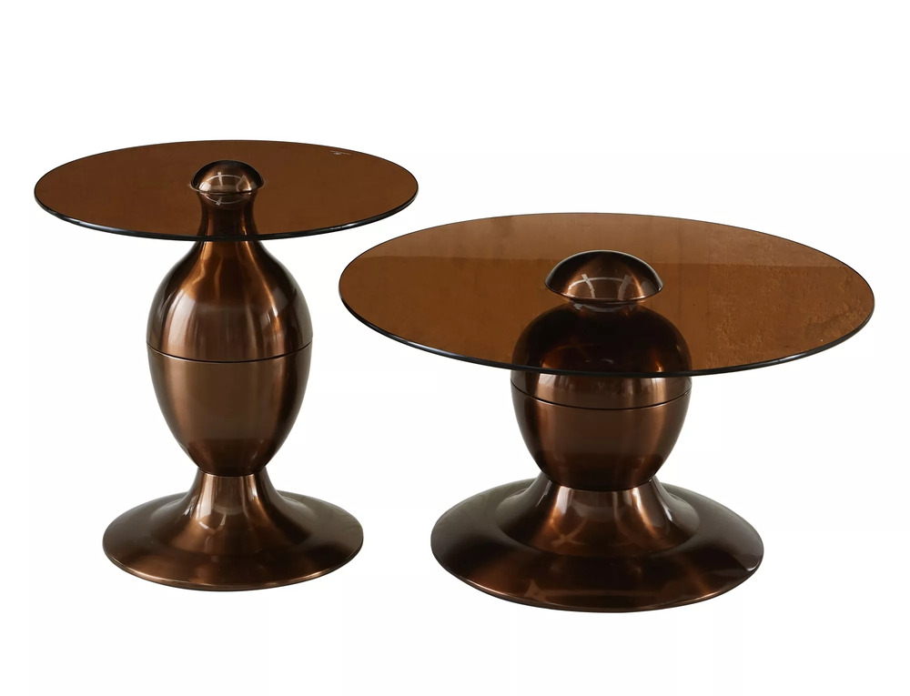 Вес, кг: 32 / Высота (см): 38/52 / Гарантия, мес.: 12 / Глубина (см): 70/50 / Количество коробок: 3 / Материал каркаса: металл / Материал столешницы: закаленное стекло / Необходимость сборки: да / Раздвижной: нет / Размер упаковки 1: 0,76/0,78/0,05 / Размер упаковки 2: 0,33/0,25/0,26 / Размер упаковки 3: 0,47/0,47/0,21 / Страна производитель: Китай / Форма столешницы: круг / Цвет каркаса: медь / Цвет столешницы: коричневый / Ширина (см): 70/50