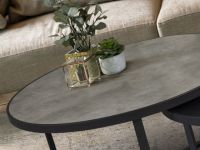 Комплект приставных столиков из металла черного матового цвета. Столешница из МДФ с высокостойкой меламиновой поверхностью, отделка серым и черным камнем. Размеры стола: ?91x41 см и ?71x36 см.