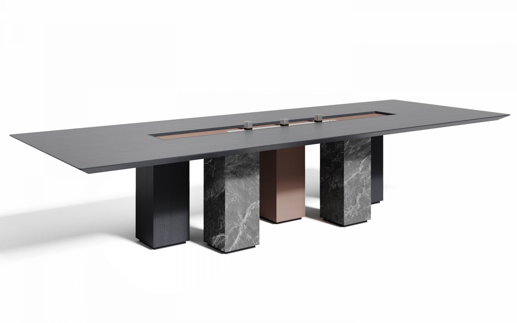 Кабинет руководителя Stone потрясающее эффектная, очень искусно созданная мебель современной стилистики. Мягкие, неброские оттенки, ясная линейная форма дополнены в ней необычными конструктивными приемами и легкими цветовыми акцентами. Необычные детали в дизайне столов и шкафов дополняют и обогащают целостность образа коллекции. Столы руководителя: Столешница толщиной 50 мм, с обратным скосом под углом 30 градусов, с покрытием rock board* + фиксированная кожаная накладка, опоры из стали с порошковым покрытием. Корпус опорной тумбы отделан шпоном дуба, тонированным в TA81 с "0% глянцевого лака. Фронтальная часть тумбы выполнена с покрытием rock board* Ящики тумбы оборудованы замком, работающим по отпечатку пальца. В тумбе - блок встроенных розеток, доступ к которым открывается за подвижной кожаной накладкой на магните, размещенной на столешнице. Опционно тумба оснащена подъемным столиком для ноутбука. Брифинг: Столешница - с отделкой искусственным камнем. У брифинга под стол с отделкой шпоном TA81 цвет опоры "антрацит" TA16. Стол переговоров: выполнен на мощной тумбе с отделкой искусственным камнем. Вторая опора - отделка шпоном. Столешница стола - шпон. Толщина столешницы 50 мм, коммуникационный блок оснащен шиной питания длиной 1 м (1 USB, 1 телефон, 1 сетевая, 1 HD) с 2 круглыми розетками + 1 USB, а нижняя часть стола оснащена пазом для проводов; Шкафы: Фасады шкафов изготовлены с отделкой rock board*. В шкафу-гардеробе, в центральной нише выполнена ниша с вешалками под одежду средней длины. По краям шкафа размещена светодиодная подсветка c t свечения 4000K, которая включается при движении дверей в центр композиции. Фурнитура Haifule, акрил толщиной 10 мм, в качестве разделителей в полках, натуральный шпон дуба, тонированный в цв. TA81, особая фурнитура для раздвижных дверей. Греденция: Фасад - искусственный камень. Боковины и топ - шпон, остальные поверхности МДФ. Фурнитура Haifule. Подсветка FS-5593 (4000K) + трансформатор + пульт управления. *Rock board: Высококачественный текстурный меламин с 3D печатью и горячим прессованием с обработкой смолой для придания эффекта "каменного шпона". Выполняется синхронное прижатие прецизионных штампов с рисунком, точно повторяющим картинку печати. В результате получается очень прочная поверхность с износостойким, антивандальным покрытием.