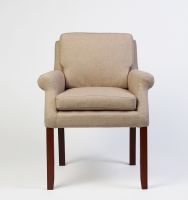 Классическое деревянное кресло в мягкой обивке. Каркас кресла изготовлен из массива бука. Пышные круглые подлокотники и подушки на спинке и сиденье формируют изящный образ комфортного кресла. Материал обивки и цвет покраски кресла подбираются по желанию заказчика.