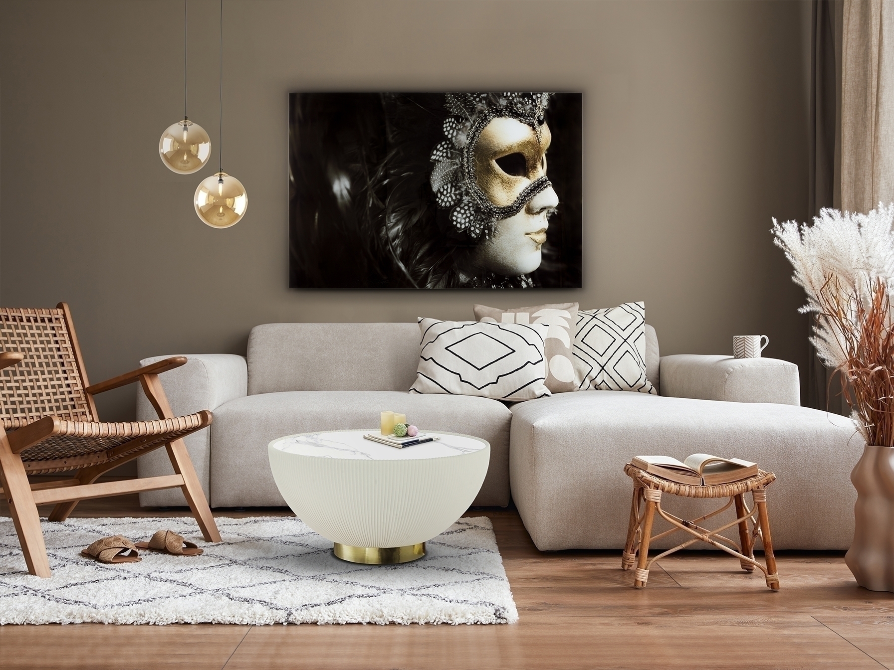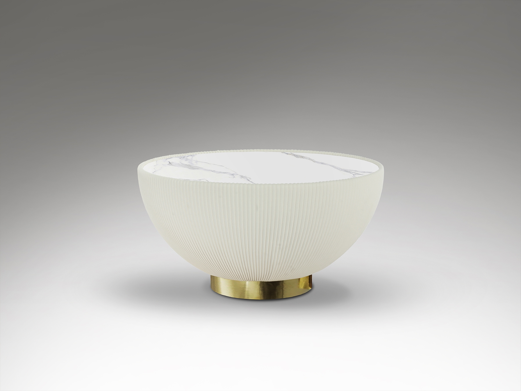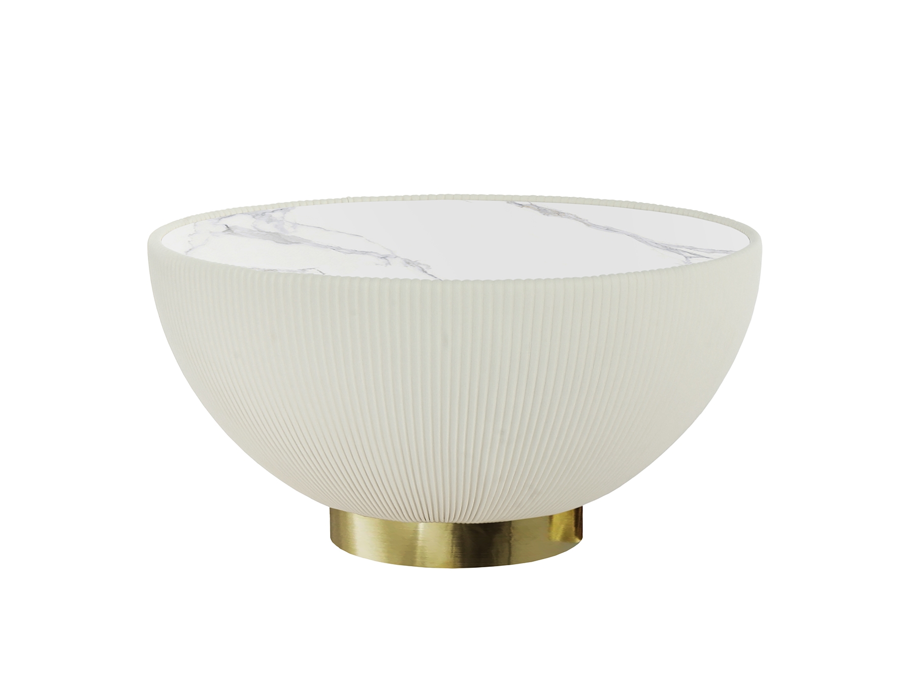 Круглый журнальный столик, обитый белой плиссированной искусственной кожей, металлическое основание с латунной отделкой и столешница из спеченного камня с эффектом белого мрамора.