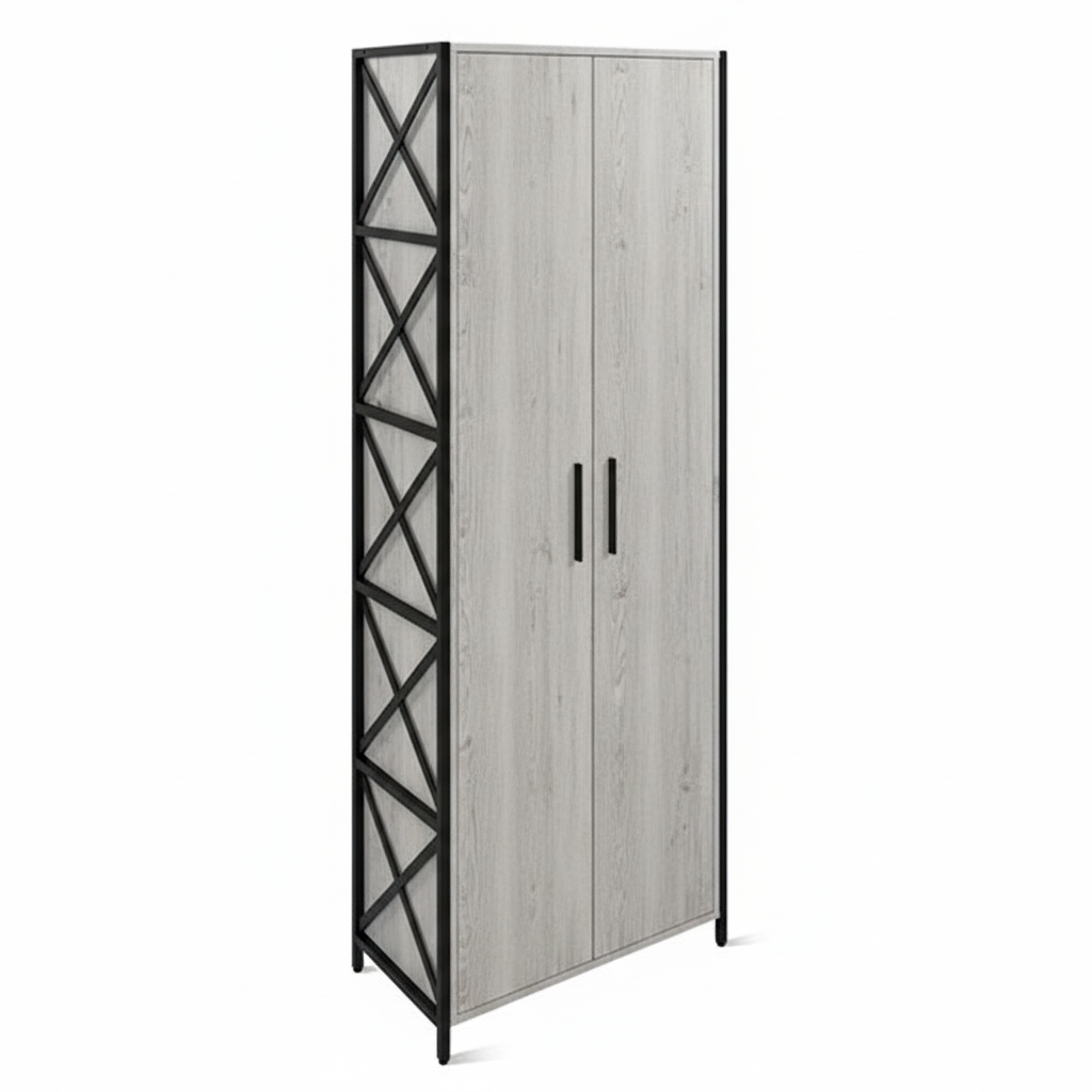 Отличное решение для вашего интерьера. Шкаф оборудован выдвижной штангой для хранения одежды на плечиках и полкой для головных уборов. Мебельные петли с доводчиком создают плавность и удобство в использовании. Чёрные металлические стильные ручки и цвет дерева Дуб Канадский гармонично вписываются в любой интерьер. Графичность модели определяют чёрные боковые стойки из металлического профиля с иксобразными элементами. Несколько шкафов легко стягиваются между собой и образуют модную и удобную систему хранения.