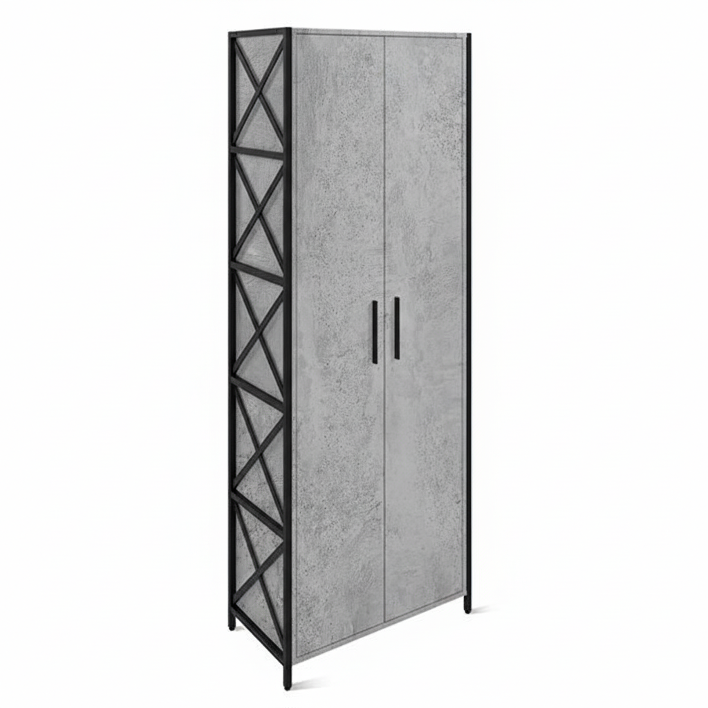 Отличное решение для вашего интерьера. Шкаф оборудован выдвижной штангой для хранения одежды на плечиках и полкой для головных уборов. Мебельные петли с доводчиком создают плавность и удобство в использовании. Чёрные металлические стильные ручки и цвет дерева Бетон гармонично вписываются в любой интерьер. Графичность модели определяют чёрные боковые стойки из металлического профиля с иксобразными элементами. Несколько шкафов легко стягиваются между собой и образуют модную и удобную систему хранения.