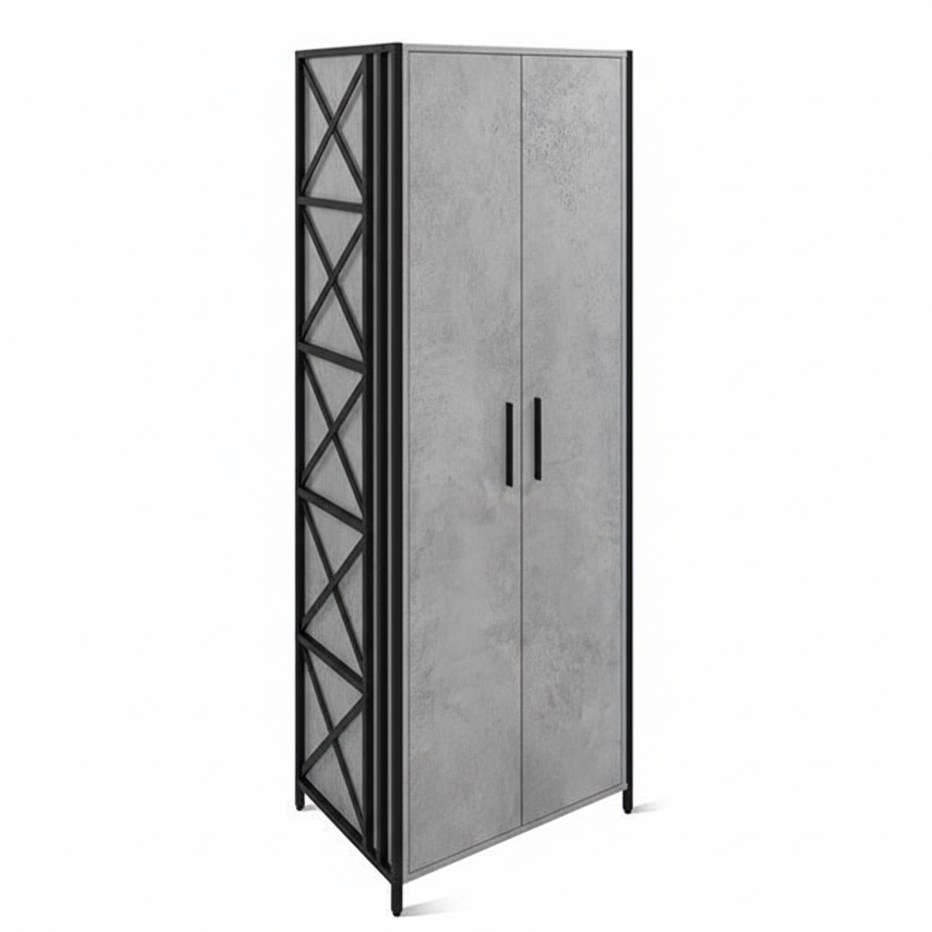 Удачное решение для вашего интерьера. Шкаф оборудован штангой для хранения одежды на плечиках и полкой для головных уборов. Оптимальная глубина шкафа позволяет хранить одежду и аксессуары в большем количестве. Стильные чёрные металлические ручки и цвет дерева Бетон гармонично вписываются в любой интерьер. Графичность модели определяют ножки из металлических стоек с иксобразными элементами. Крепление боковых стоек универсальное, поэтому вы можете их переворачивать как вам удобно, располагая вертикальные профили спереди или сзади. Несколько шкафов легко стягиваются между собой и образуют удобную систему хранения.