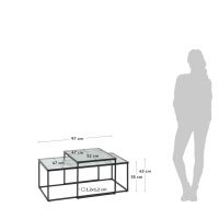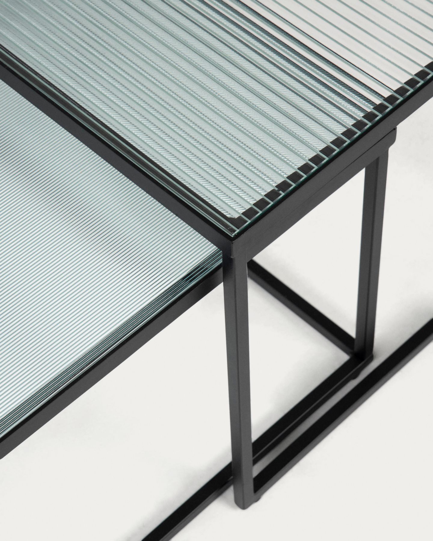 Набор из 2 столиков Akemi от фабрики La Forma – идеальная индустриальная атмосфера из текстурированного стекла. Столики Akemi – это непревзойденный дизайн в духе промышленного минимализма. Текстурированное стекло в гармонии с четкой геометрией убеждают в превосходстве форм и фактур в современном модерне. Большой плюс в том, что столики имеют разную высоту, поэтому малый можно ставить над большим. Этот оригинальный дизайнерский ход безусловно привнесет в ваш интерьер новую ноту. Столики имеют четкую геометрическую форму прямоугольника и квадрата. Столешница выполнена из текстурированного закаленного стекла толщиной 5 мм. Стекла помещены в рамочный каркас, имеющий сварную структуру. Он выполнен из металла и покрыт черной порошковой краской. Элементы каркаса имеют форму квадратных трубок с шириной грани 1,2 см. Максимальная нагрузка на каждый столик не должна превышать 15 кг. Размеры: ширина – 97 и 47 см, глубина – 47 и 52 см, высота – 35 и 43 см (второе значение дано для квадратной модели). Суммарный вес изделий – 15 кг. Сборка займет 20 минут. Крепеж входит в комплектацию.
