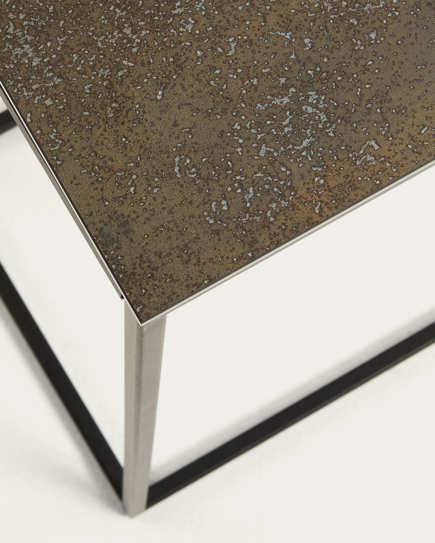 Приставной стол Rewena от фабрики La Forma – керамическая столешница на стальном основании в духе минимализма. Приставной стол Rewena не оставляет сомнений в том, что является ярким представителем минимализма. Простая конструкция и практичность, прочность и современные материалы – все это видно невооруженным взглядом. Когда нужно добавить немного удобства в интерьер, но без «перегруза», то Rewena будет кстати. Стол прямоугольной формы. Столешница сделана из закаленного стекла и керамики (двухслойная). Она имеет толщину 7 мм, ударопрочная, легко очищается от загрязнений. Каркас металлический, покрыт черной порошковой краской. Он имеет сварную рамочную структуру, с шириной ножек 1,3 см. Для защиты напольного покрытия, на углах основания предусмотрены пластиковые накладки. Максимальная нагрузка на столик не должна превышать 30 кг. Размеры: ширина – 45 см, глубина – 30 см, высота – 60 см. Вес – 5,9 кг. Потребуется сборка.