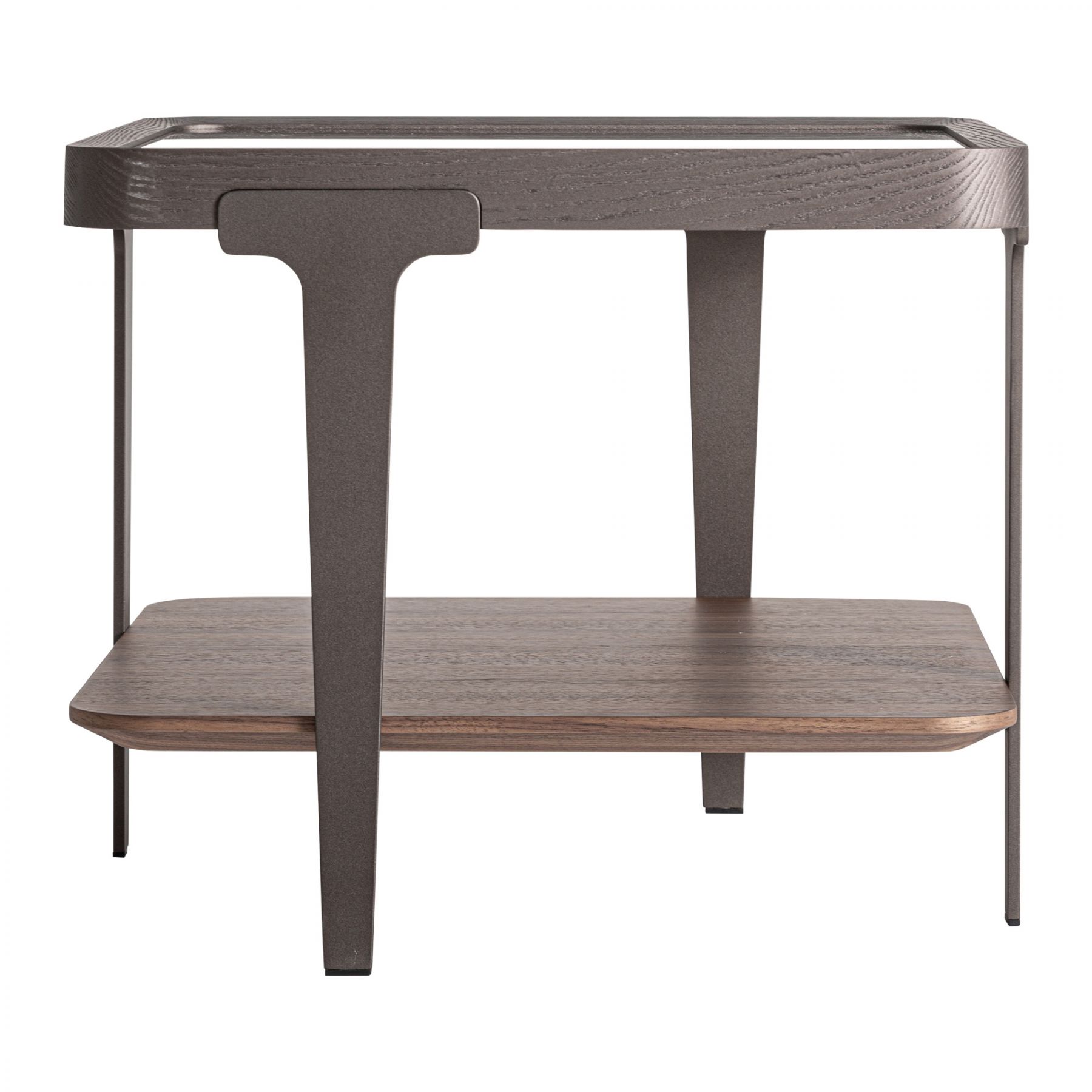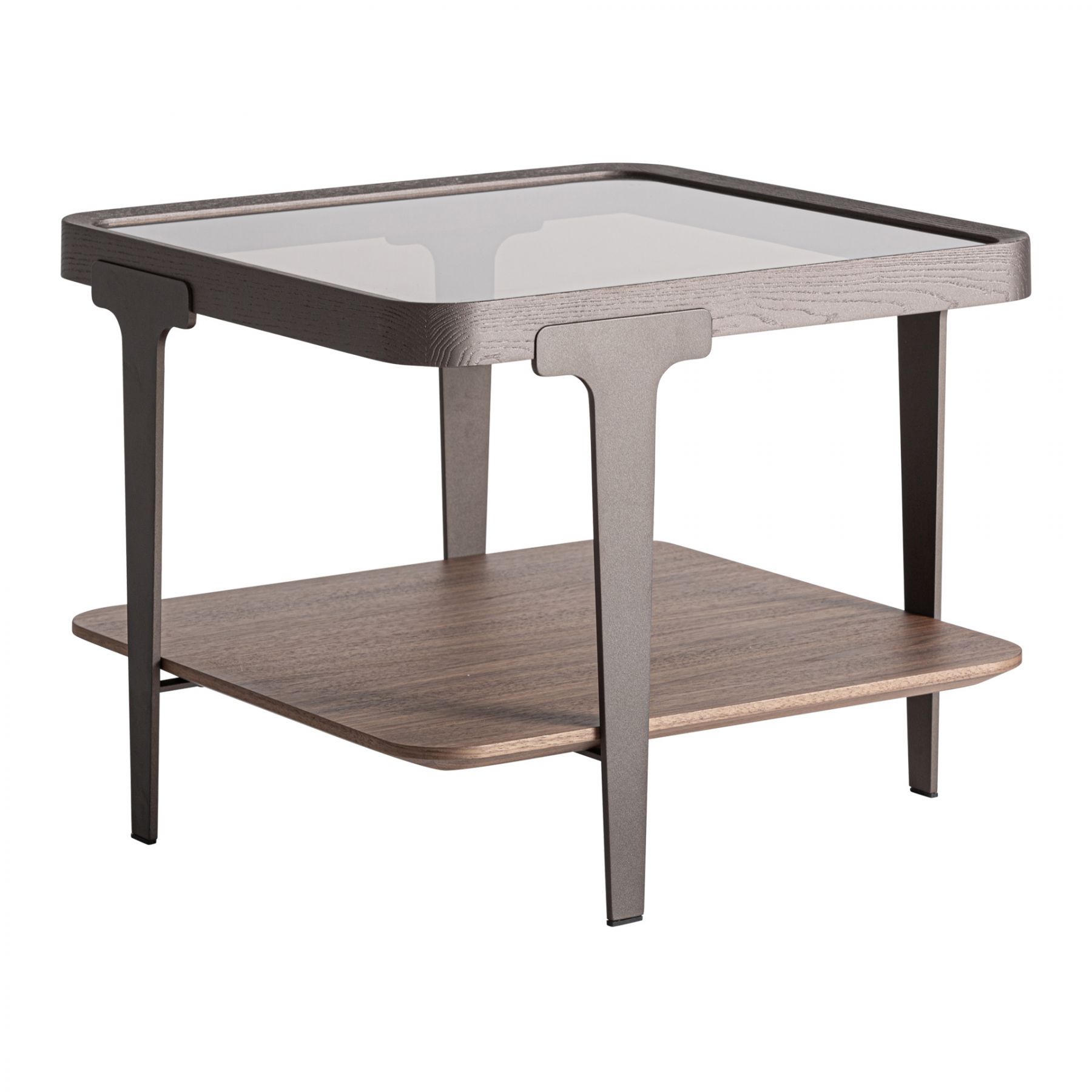 Приставной столик из коричневого ясеня в сочетании с серым стеклом с дымчатой отделкой и черным железом. Ширина: 60 см, Глубина: 60 см, Высота: 50 см