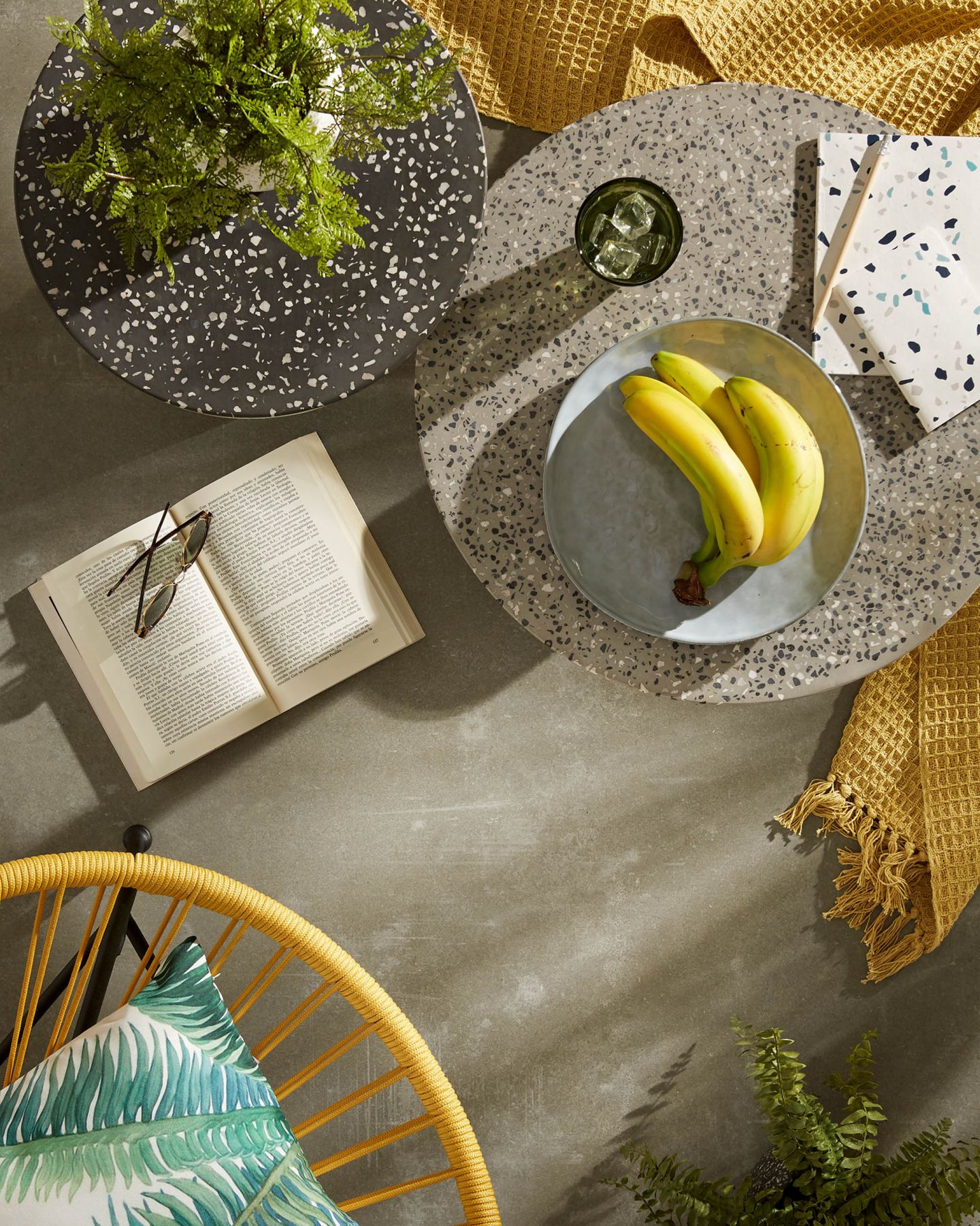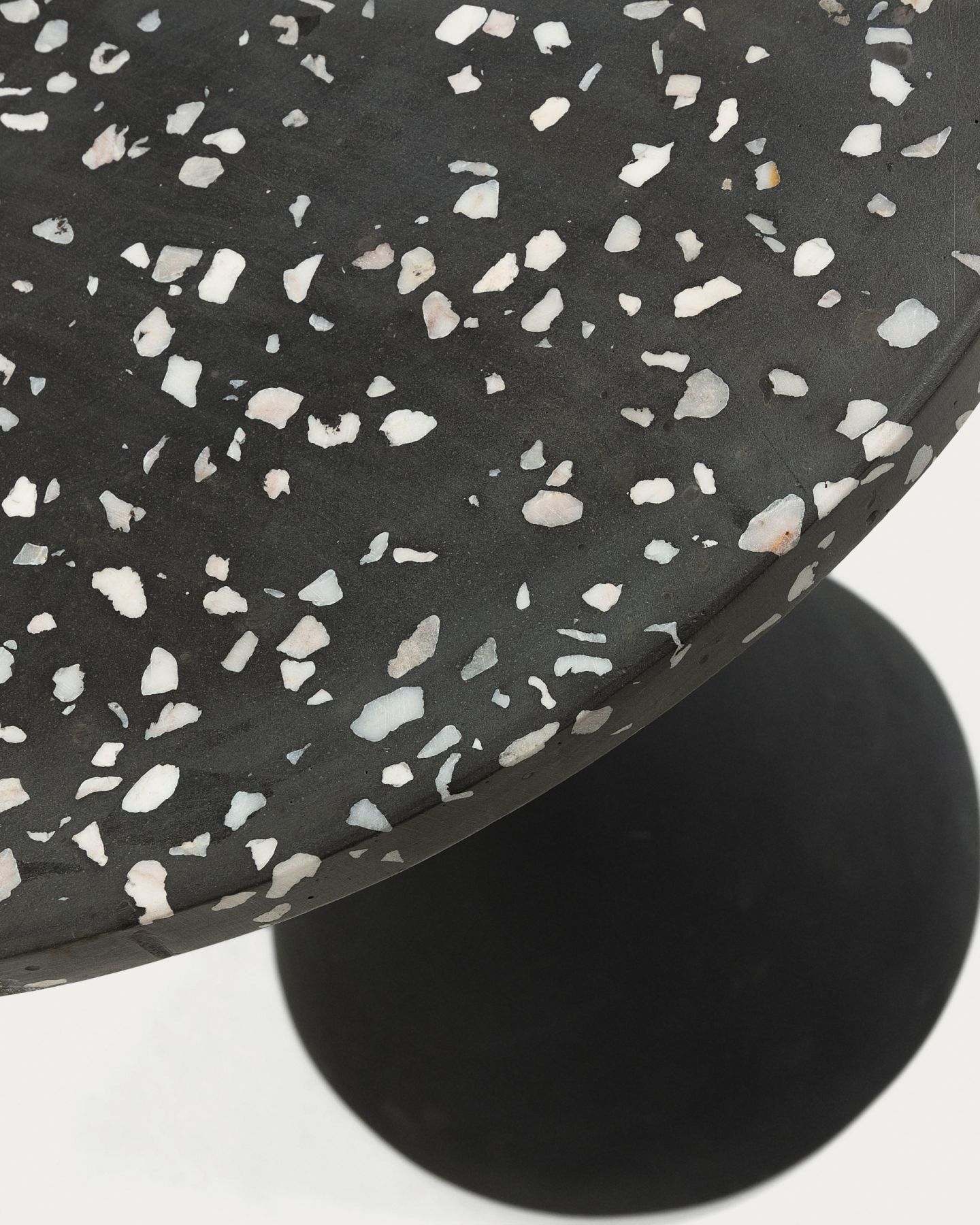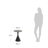 Приставной столик Melano терраццо черный от фабрики La Forma – верхушка из терраццо и надежная устойчивость. Приставной столик Melano – это стильный предмет вспомогательной мебели для уличного и домашнего использования. Особая форма опоры обеспечивает устойчивость на любой поверхности, а камень со специальным покрытием не испортится даже при длительном контакте с влагой. Такая миниатюрная модель – подарок для городского минимализма. Столик Melano состоит из двух частей – круглой столешницы и треугольной стойки. Столешница сделана из камня терраццо и покрыта специальной пропиткой, защищающей ее от пятен и негативного действия влаги. Опора металлическая, с черным порошковым покрытием. Вверху она имеет трубчатую форму, а внизу конусную с шириной основания 25 см. Такая конструкция обеспечивает хорошую устойчивость. Нижняя поверхность имеет резиновую накладку для защиты напольного покрытия от повреждений. Максимально допустимая нагрузка – 20 кг. Размеры: ширина – 40 см, высота – 50 см. Вес – 12 кг. Потребуется минимальная сборка. Просим вас обратить внимание на следующий важный момент: если вы планируете хранить уличную мебель на открытом воздухе, пожалуйста, защитите ее водонепроницаемым чехлом в осенний, зимний периоды и во время сезона дождей. Это поможет сохранить мебель в отличном состоянии и продлить ее срок службы.
