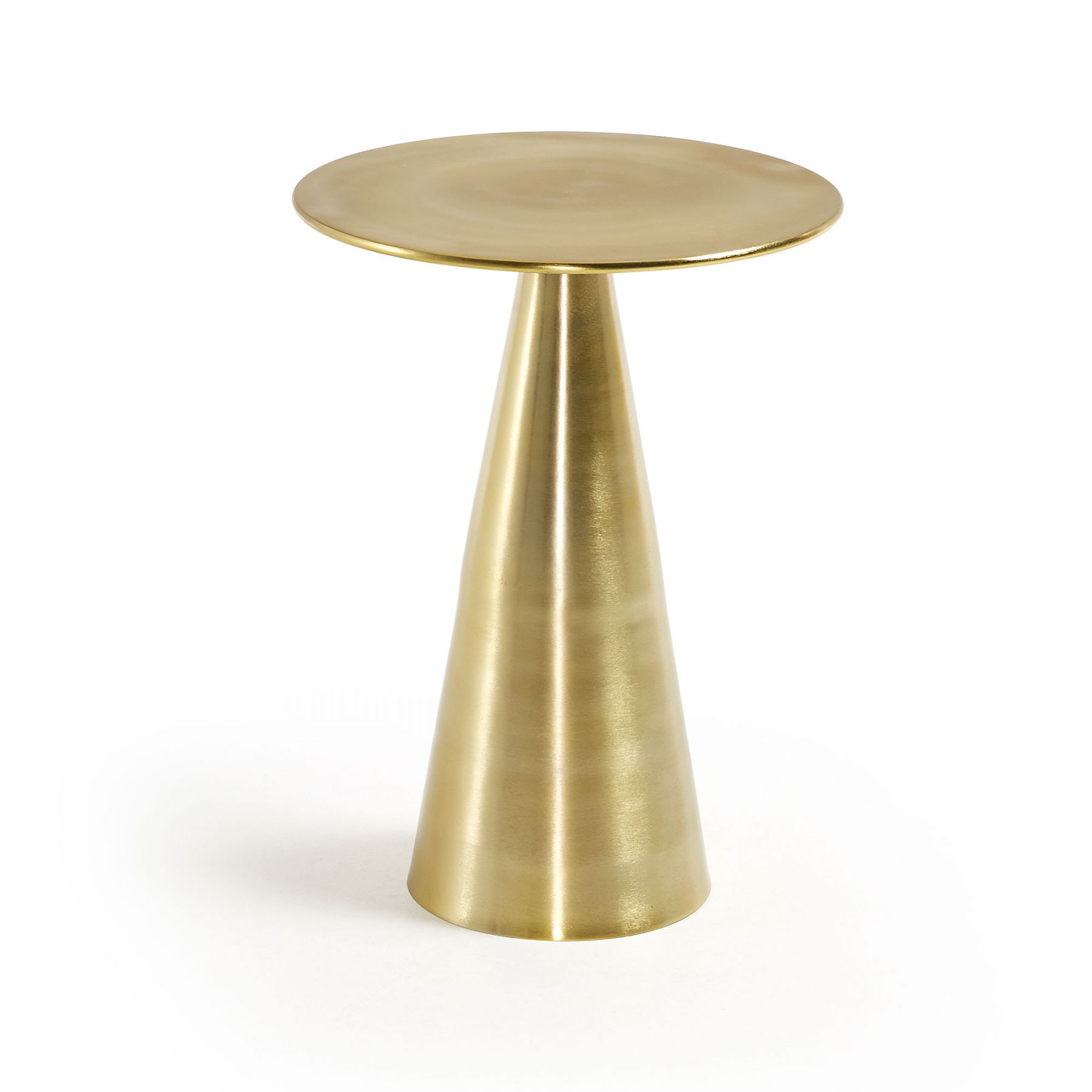 Приставной столик Rhet золотой – стильный предмет интерьера для эффектного акцента в городской квартире. Приставной столик Rhet золотой выглядит лаконично и по-дизайнерски стильно. Он легко сможет заменить прикроватную тумбочку в спальне или стать удобной подставкой для чашки с кофе возле любимого кресла в гостиной. Круглая форма и компактные габариты позволят справиться с любой ролью в вашем доме. Столик полностью выполнен из алюминия. Он имеет сборную конструкцию, состоящую из конусной опоры и круглой столешницы. Столешница имеет толщину 0,8 см и диаметр 38,5 см. Она способна выдерживать весовую нагрузку до 15 кг. Диаметр конусной опоры вверху составляет 6 см , а в основании 22 см, что обеспечивает устойчивость на любом напольном покрытии. Вся поверхность изделия покрыта латунным напылением. Его блеск выглядит эффектно и ярко, но требует деликатного ухода (не допускается использование абразивных чистящих средств). Высота столика составляет 56, 5 см. Вес – 3,7 кг. Потребуется минимальная самостоятельная сборка.