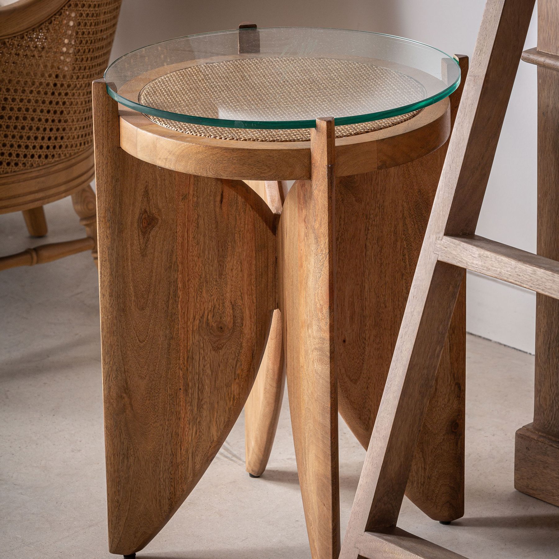 Приставной столик Riesa, натуральный цвет, колониальный стиль. Изготовлен из древесины манго в сочетании со стеклом и ротангом.