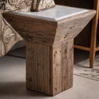 Приставной столик Samsung, цвет натуральный/состаренный белый, в этническом стиле. Изготовлен из переработанной сосновой древесины в сочетании с мрамором. Различные породы дерева: сосна, манго, тик, акация.