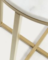 Приставной столик Sheffield ? 43 от фабрики La Forma – мраморная столешница на тонкой изящной опоре. Приставной столик Sheffield – это максимально облегченная конструкция и роскошь мрамора. Столик не только займет минимум места, но визуально не утяжелит пространство. Его легкость – это заслуга тонких рамочных опор. А красота видна невооруженным взглядом – это мрамор, который всегда безупречен. Столик состоит из металлической стойки и круглой столешницы. Столешница выполнена из мрамора. Вместе с опорой ее высота составляет 3,2 см. Стойка окрашена в цвет латуни. Покрытие не портится при контакте с влагой, легко очищается от загрязнений. На каждой ножке предусмотрены специальные накладки, которые защищают напольное покрытие от повреждений. Максимальная нагрузка на столик – 25 кг. Размеры: диаметр – 43 см, высота – 71 см. Вес – 9 кг. Потребуется небольшая самостоятельная сборка. В коллекции мебели La Forma есть журнальный стол с аналогичным дизайном.