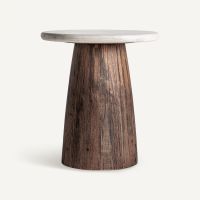 Журнальный столик Skorup в деревенском стиле, изготовлен из переработанной древесины коричневого цвета с состаренной отделкой в сочетании с белым мрамором.