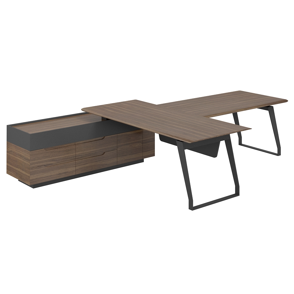 Кабинет QUARTZ - эпицентр всех ключевых событий и элемент имиджа его владельца. Он как прекрасный «купаж» объединяет в себе сразу несколько стилей – минимализм и классику. Поверхности из натурального шпона «американский орех» в сочетании с металлическими опорами уникального сечения создают индивидуальный стиль для кабинета руководителя.