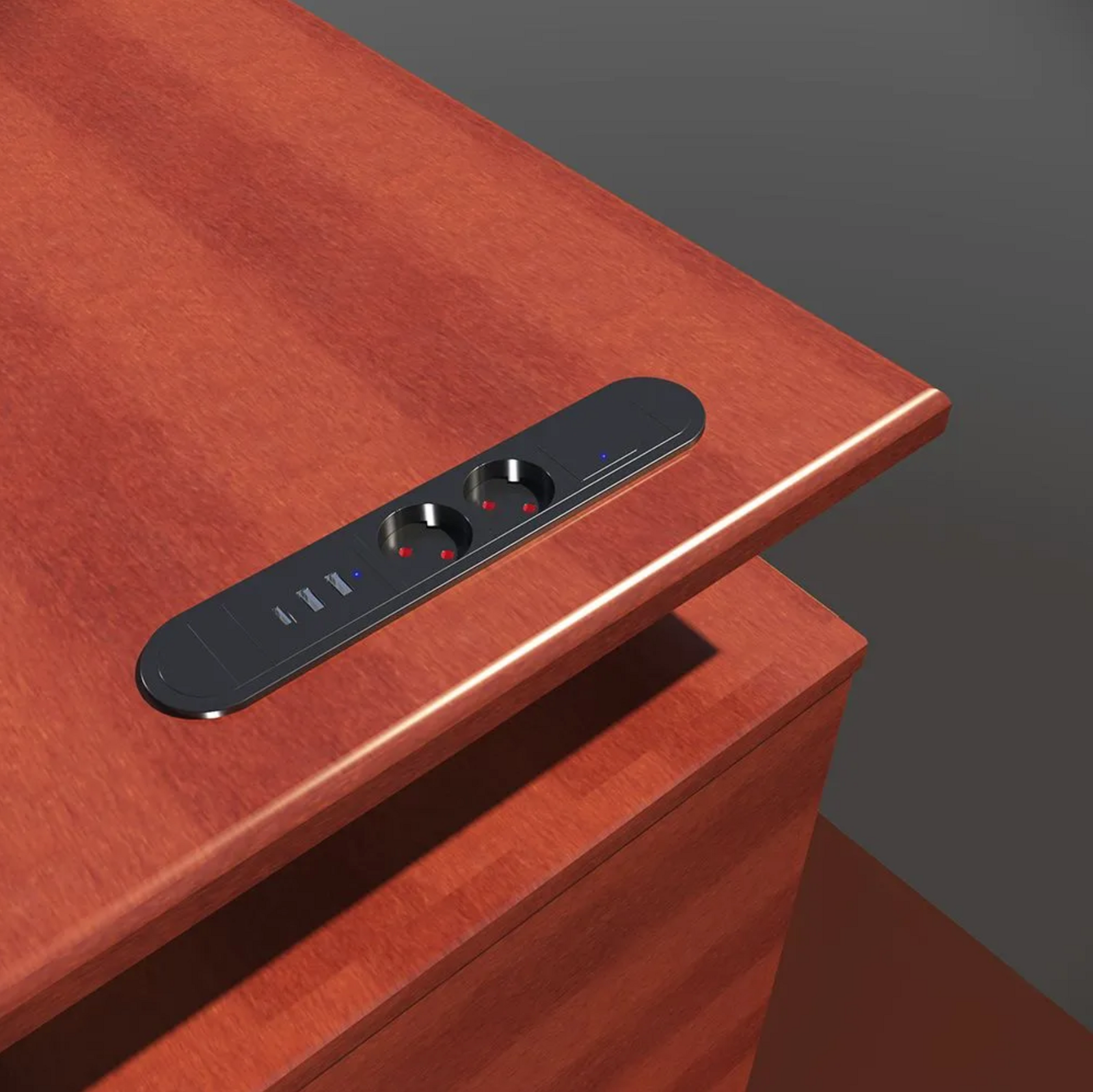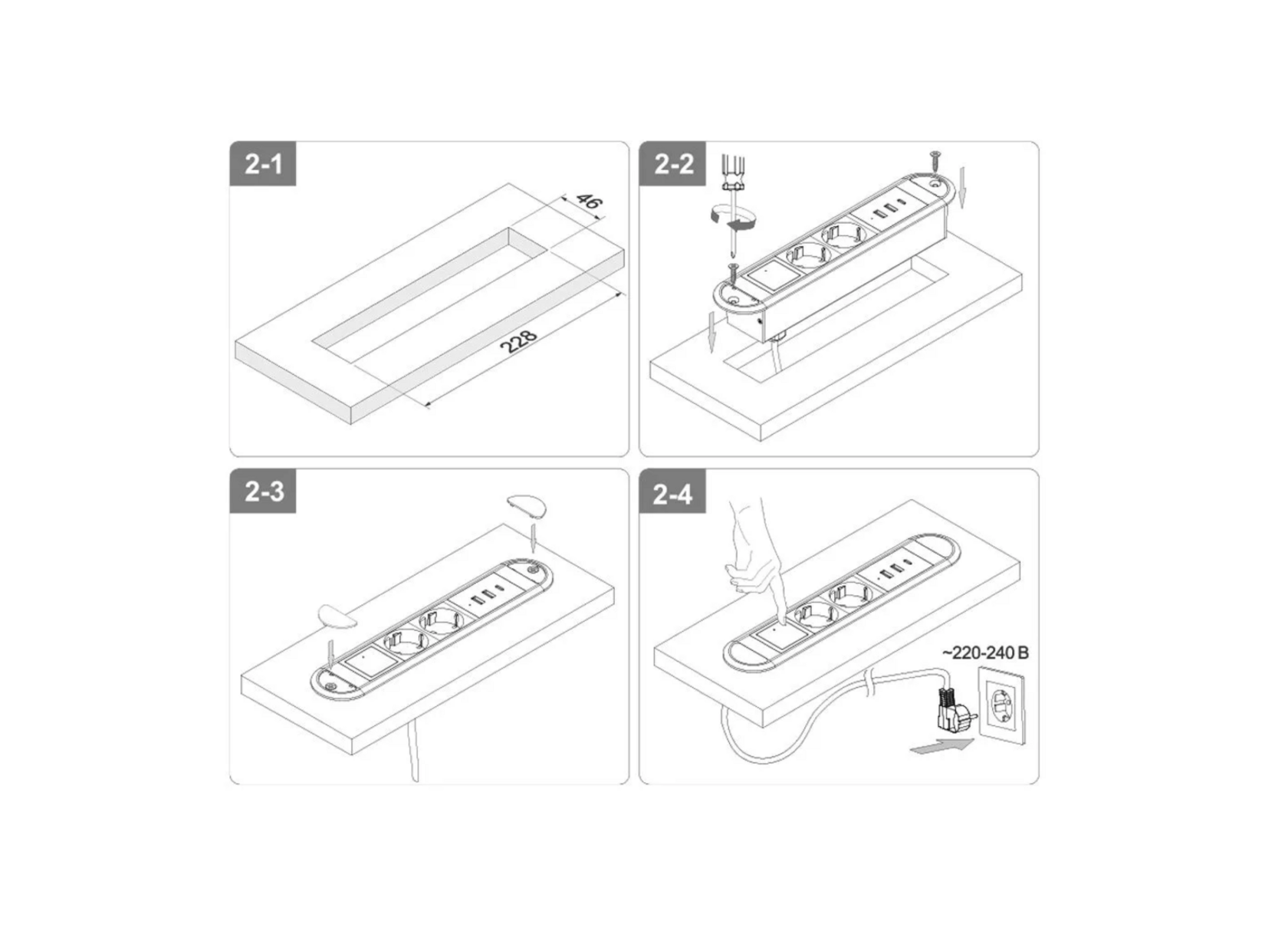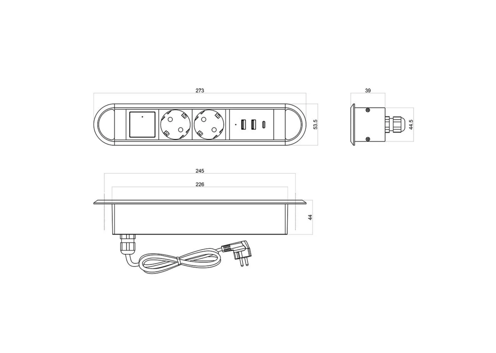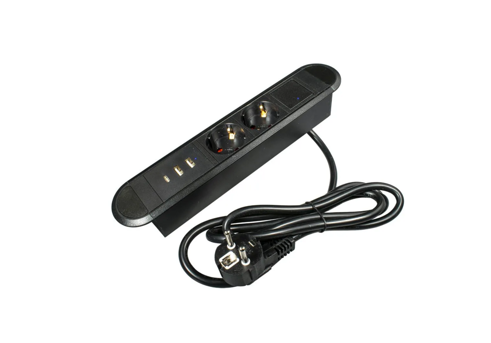 Спецификация Выдвижная розетка сертифицирована в РФ. Гарантия 2 года. Комплектация: Полностью в сборе: с внутренней проводкой, монтажной коробкой, проводом 1.5 м с вилкой, два USB типа A зарядных и один USB C зарядный. Наименование BM-02-20 Габаритные размеры: 27.3 см х 5.35 см Врезные размеры: 22.6 см х 4.45 см х 4.45 см Количество розеток - 2 USB A, 1 USB C, 2 EURO Напряжение 110-240 В USB - 2хUSB type A + USB type C - 5 В, 3 А; Максимальный ток 12 А Максимальная мощность 2700 Вт Цвет корпуса Чёрный Материал: Корпус, верхняя рамка, установочная коробка из металла, боковины ABS пластик Розетка встраиваемая, врезная, розетка в стол, удлинитель для кухни и офиса BM-02-20 (чёрный, 2 USB A, 1 USB C, 2 EURO) Блок розеток BM-02-20 - малогабаритный встраиваемый блок розеток, включающий 2 розетки SCHUKO и набор зарядных устройств разных типов USB A - 2 шт. и USB С (5В), а также имеет встроенный выключатель. Блок розеток BM-02-20 предназначены для установки в мебель и будет прекрасно смотреться в письменных столах и тумбах. Занимая минимальную площадь и имея оптимальную комплектацию, розеточный блок BM-02-20 будет отличной опцией для любой мебели, особенно мебели для офисов, кабинетов, конференц-залов. Выключатель, установленный в корпусе блока розеток BM-02-20, находится в одной плоскости с розетками и USB и состояние вкл/выкл сигнализирует светодиод миниатюрных размеров, смонтированный внутри выключателя. Блок розеток BM-02-20 не только удачное техническое решение вопросов подключения гаджетов к сети 220В и их зарядки, но и отличный выбор с точки зрения дизайна и экономии площади на рабочей поверхности.