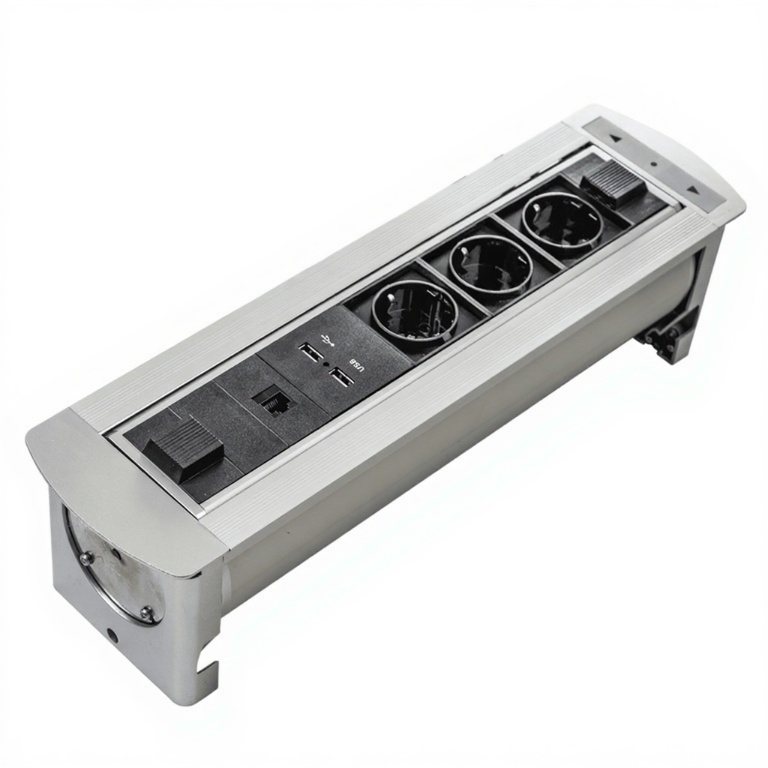 Спецификация Комплектация: Полностью в сборе: с внутренней проводкой, монтажной коробкой, проводом 2 м с вилкой Наименование FLIP Количество розеток 3 EURO, 2 USB, RJ45 Напряжение 220-250 В Максимальный ток 16 А Максимальная мощность 3500 Вт Цвет корпуса Серебристый Врезное отверстие 368х100 мм Метки товара: Поворотный блок розеток Выдвижная розетка сертифицирована в РФ. Гарантия 2 года. Сенсорный врезной блок розеток FLIP (3 EURO, 2 USB, RJ45) Центральная часть переворачивается автоматически, на лицевой панели 2 кнопки открытия и закрытия, розетка оснащена 3 розетками, 2 USB и RJ45. Врезное отверстие 368х100 мм. Конструкция Удлинитель состоит из алюминиевого корпуса, встроенного блока розеток и присоединенного кабеля с вилкой. Блок включает 3 евро розетки, 2 USB и порт RJ45 Ethernet. Корпус изделия изготовлен из алюминиевого сплава, отличается высокой прочностью и надежностью, имеет привлекательный внешний вид, не стареет со временем. Оснащен сенсорными кнопками, полностью автоматизирован. Благодаря устойчивости к высоким температурам, коррозии, ультрафиолетовым лучам, он обеспечит ручному удлинителю длительный срок службы. Установка Удлинитель на 3 розетки, 2 USB и Интернет порт FLIP монтируется посредством установки в вырез на горизонтальной деревянной поверхности. Плоские, ровные выступы по периметру изделия плотно прилегают к основанию, обеспечивают эстетичный внешний вид.