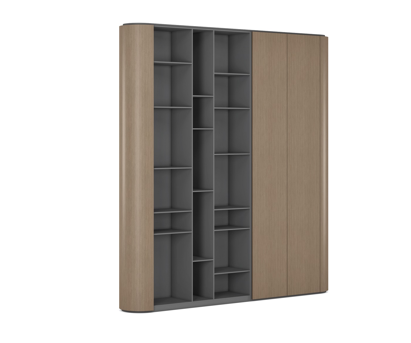 Новая коллекция FOSTER идеально подходит для создания удобной и продуктивной офисной среды. Выполненная в шпоне эта коллекция благодаря интересному дизайну, разнообразию предметов и их комбинаций станет прекрасным решением при оформлении офиса премиального уровня. Кабинет выполнен в современных серых оттенках: шпон цвета "Серебристый жемчуг". Столешница изготовлена в виде крыла со скошенным краем под 45 градусов. Рабочий стол может иметь два варианта конфигурации опорных тумб: стандартную и тумбу с огибающим её П-образным контуром. Любая тумба может быть укомплектована столиком под ноутбук с телескопической системой регулировки высоты. Система позволяет в течении нескольких секунд изменить высоту от 600 до 1000 мм, а функция памяти запомнить 3 установленных значения для быстрого переключения.
