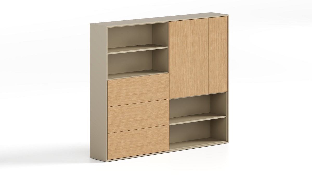 AURUS это современный лаконичный кабинет, без лишних чрезмерных акцентов, идеальное сочетание цены и качества, универсальность модульных систем по шкафам и столам переговоров. Шпон столешниц, опор и фасадов гармонично сочетается с однотонным ламинатом панелей МДФ.