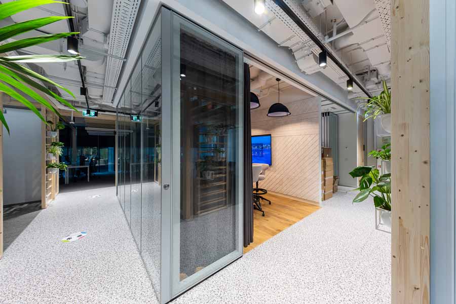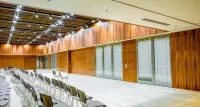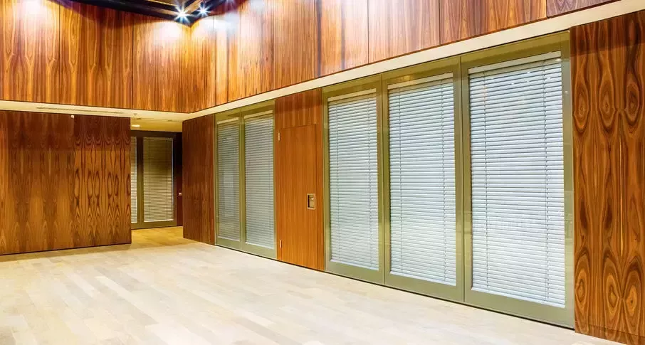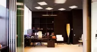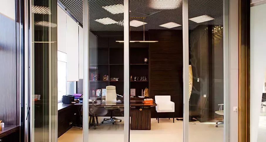 | Звукоизоляция. В собранном виде раздвижные стеклянные перегородки обладают звукоизоляцией до 42 дБ. Показатель достигается за счет уплотняющих элементов, толстого стекла, шумопоглощающего материала в профильной системе.