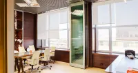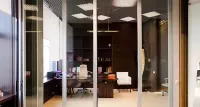 | Дизайн. Стекло можно тонировать, нанести на него пескоструйные изображения, логотипы, использовать фотопечать. Прозрачность регулируется — можно купить прозрачные или матовые раздвижные стеклянные перегородки.