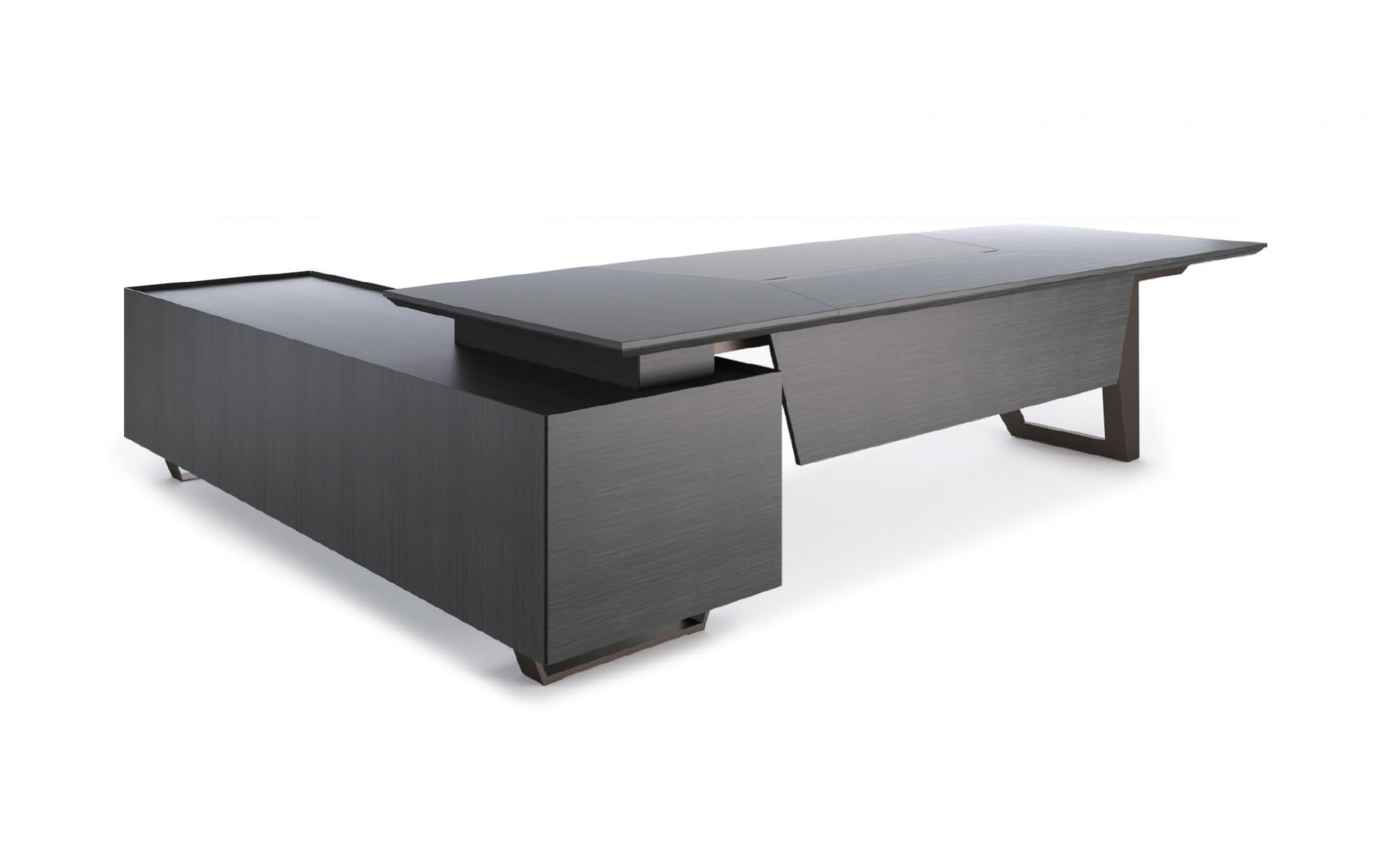 Столешница стола руководителя имеет составную конструкцию – верхняя часть выполнена из 4-х сегментов трапецевидной формы, 3 сегмента – МДФ, толщиной 16 мм, облицованных шпоном, тонированным в цвет "Римский дуб TA24YA", один сегмент МДФ инкрустированный натуральной кожей благородного серого оттенка. Сегменты крепятся к подстолью, выполненному со скосом 30 градусов и облицованному шпоном, тонированным в цвет "Римский дуб TA24YA". Общая толщина столешницы в сборе 50 мм. Крышка кабель канала выполнена из полированного металла, шириной 50 мм и толщиной 4 мм и имеет специальные выемки слева и справа под коммуникации. Столешница устанавливается на мощное металлическое подстолье, изготовленное из профиля сложного сечения и с одной стороны опирается на профилированную на металлическую ногу, установленную под углом 120 градусов, а с другой на опорную тумбу. Сторона размещения тумбы определяет ориентацию стола. Стол не является универсальным. Опорная тумба выполнена с 2-мя ящиками 2-мя нишами, закрытыми глухими фасадами. Правая ниша оборудована полкой, которая делит ее на 2 равных части. Левая ниша снабжена вертикальной стойкой в которой смонтирован коммуникационный блок, который включает в себя 3 розетки 220В, 1 телефонную розетку и 1 розетку для подключения интернета. В верхнем топе тумбы отверстие для коммуникаций. Наружная часть тумбы – шпон. Фасады – шпон, ручка отсутствует, ее заменяет верхняя часть фасада, скошенная под 30 градусов и выступающая за габариты топа, что позволяет открывать двери и ящики. Боковины и задняя стенка тумбы также выступают над поверхностью топа на 18 мм.