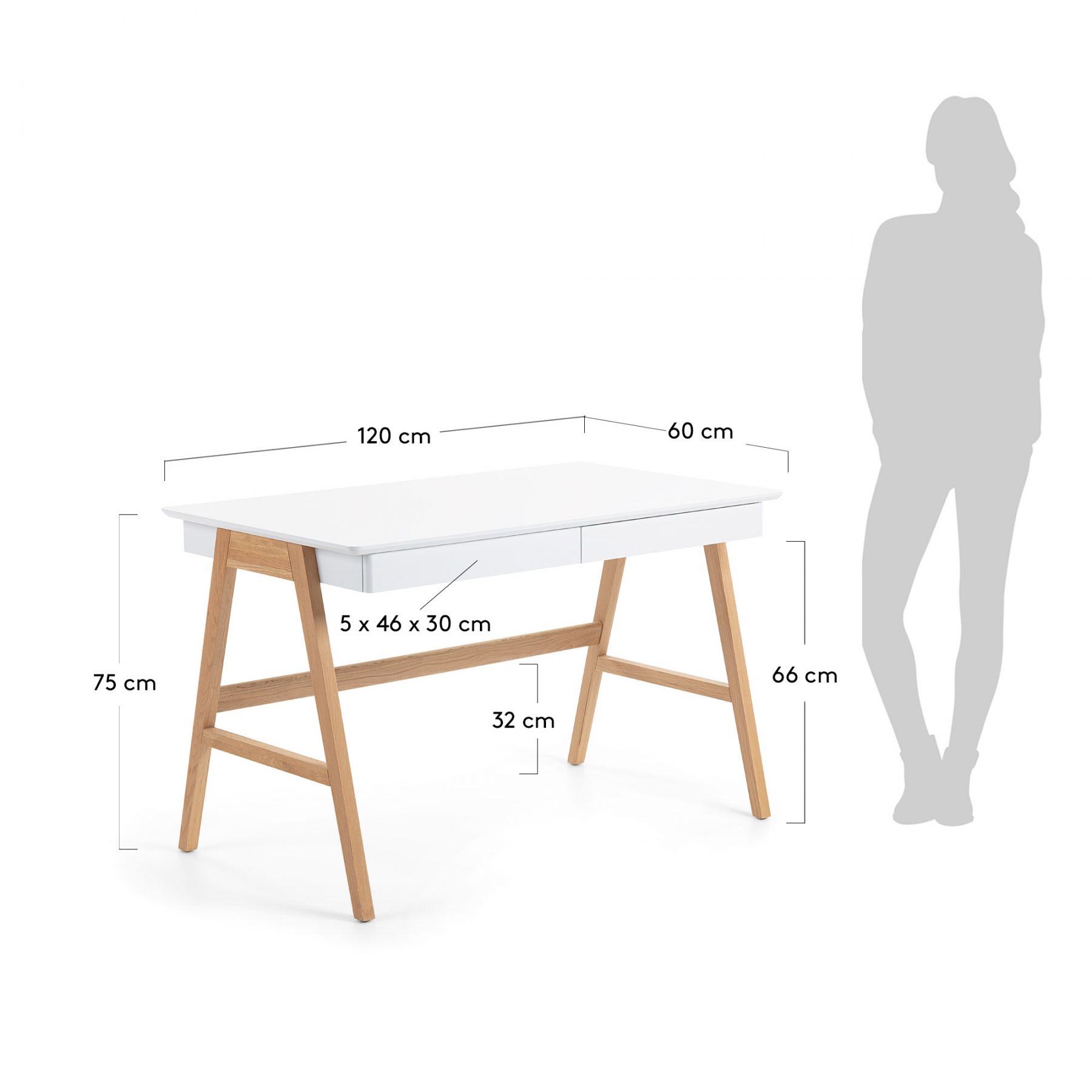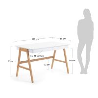 Письменный стол INGO от фабрики La Forma (ex Julia Grup) — испанский подход к созданию стильного рабочего места. Просто неповторимый стол! Необычная конструкция мгновенно привлекает внимание. Выходящие за грани столешницы ножки — это явно не элемент классического предмета мебели для работы. Поэтому стол подойдет творческим людям, которым важно вдохновляться всегда и во всем, даже собственным письменным столом! Данный предмет мебели создан в современном стиле, поэтому легко впишется в любую квартиру, оформленную в том же направлении. Его можно использовать как для работы за ноутбуком, так и для решение повседневных задач. Цветовая палитра универсальная. Столешница — белая. Она имеет классическую прямоугольную форму и снабжена выдвижным ящиком. В данном случае дизайнеры не стали отвлекать внимание от лаконичного вида рабочего пространства ручкой для ящика. Ее нет. Но благодаря небольшому нажатию, он легко будет выдвигаться. В ящике можно хранить канцелярские приборы, бумаги, документы и прочие вещи. Ножкам оставлен натуральный цвет. Они сделаны из дерева и расставлены в стороны, подобно конструкции стремянки. Это необычное решение выглядит не только оригинально, но и гарантирует столу хорошую устойчивость. Для нее же предусмотрена поперечная балка, соединяющая обе пары ножек. Размеры — 120 см ? 75 см ? 60 см (ширина, высота, глубина). Вес — 24,3 кг. Также фабрика La Forma (ex Julia Grup) производит и другие модели письменных столов, с которыми можно ознакомиться здесь же.