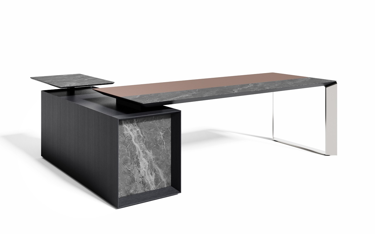 Кабинет руководителя Stone потрясающее эффектная, очень искусно созданная мебель современной стилистики. Мягкие, неброские оттенки, ясная линейная форма дополнены в ней необычными конструктивными приемами и легкими цветовыми акцентами. Необычные детали в дизайне столов и шкафов дополняют и обогащают целостность образа коллекции. Столы руководителя: Столешница толщиной 50 мм, с обратным скосом под углом 30 градусов, с покрытием rock board* + фиксированная кожаная накладка, опоры из стали с порошковым покрытием. Корпус опорной тумбы отделан шпоном дуба, тонированным в TA81 с "0% глянцевого лака. Фронтальная часть тумбы выполнена с покрытием rock board* Ящики тумбы оборудованы замком, работающим по отпечатку пальца. В тумбе - блок встроенных розеток, доступ к которым открывается за подвижной кожаной накладкой на магните, размещенной на столешнице. Опционно тумба оснащена подъемным столиком для ноутбука. Брифинг: Столешница - с отделкой искусственным камнем. У брифинга под стол с отделкой шпоном TA81 цвет опоры "антрацит" TA16. Стол переговоров: выполнен на мощной тумбе с отделкой искусственным камнем. Вторая опора - отделка шпоном. Столешница стола - шпон. Толщина столешницы 50 мм, коммуникационный блок оснащен шиной питания длиной 1 м (1 USB, 1 телефон, 1 сетевая, 1 HD) с 2 круглыми розетками + 1 USB, а нижняя часть стола оснащена пазом для проводов; Шкафы: Фасады шкафов изготовлены с отделкой rock board*. В шкафу-гардеробе, в центральной нише выполнена ниша с вешалками под одежду средней длины. По краям шкафа размещена светодиодная подсветка c t свечения 4000K, которая включается при движении дверей в центр композиции. Фурнитура Haifule, акрил толщиной 10 мм, в качестве разделителей в полках, натуральный шпон дуба, тонированный в цв. TA81, особая фурнитура для раздвижных дверей. Греденция: Фасад - искусственный камень. Боковины и топ - шпон, остальные поверхности МДФ. Фурнитура Haifule. Подсветка FS-5593 (4000K) + трансформатор + пульт управления. *Rock board: Высококачественный текстурный меламин с 3D печатью и горячим прессованием с обработкой смолой для придания эффекта "каменного шпона". Выполняется синхронное прижатие прецизионных штампов с рисунком, точно повторяющим картинку печати. В результате получается очень прочная поверхность с износостойким, антивандальным покрытием.