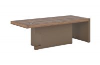 Коллекция кабинетов ERA – яркий символ прогресса человеческой цивилизации и возвращения к истокам бытия. В “рубленых» брутальных формах монолитных предметов интерьера заложена мощь интеллекта нашего современника и тысячелетняя мудрость предков. В простоте конструктивных решений и колорите инновационных материалов под натуральные дерево и кожу обнаруживается совершенство. Владелец этого кабинета знает, как устроен мир, он не будет размениваться по мелочам, когда идет к своей цели. Он ценит настоящую, а не мнимую, роскошь, его бизнес солиден и респектабелен, а удобство и комфорт он ценит превыше всего в жизни. По своей геометрии удлиненная тумба как бы «обтекает» опоры стола. Шкафная группа состоит из 3-х предметов, объединенных под единым топом и декорированных боковыми панелями из современного и «легкого» материала тамбурат. Сами шкафы слегка «утоплены» в паспарту, что придает законченный вид всей композиции.