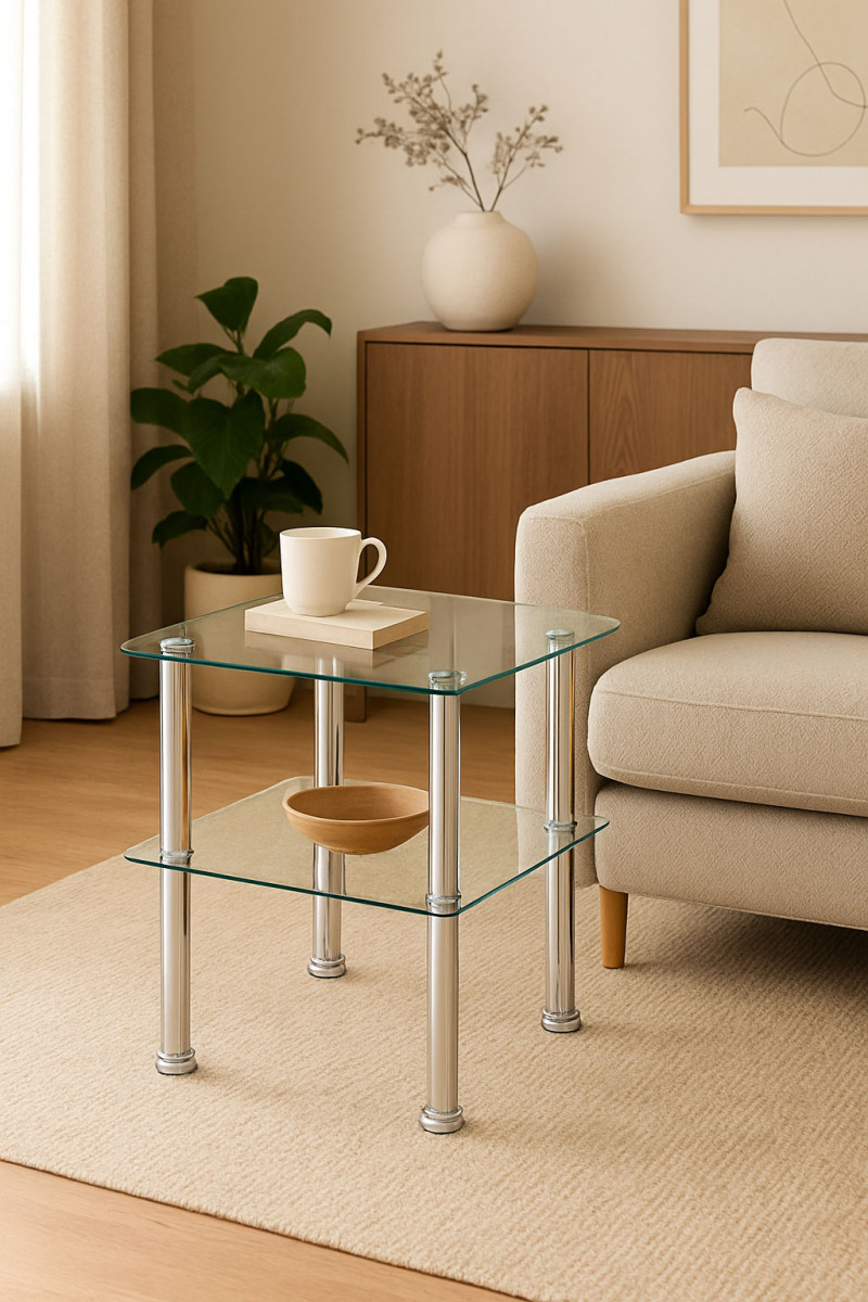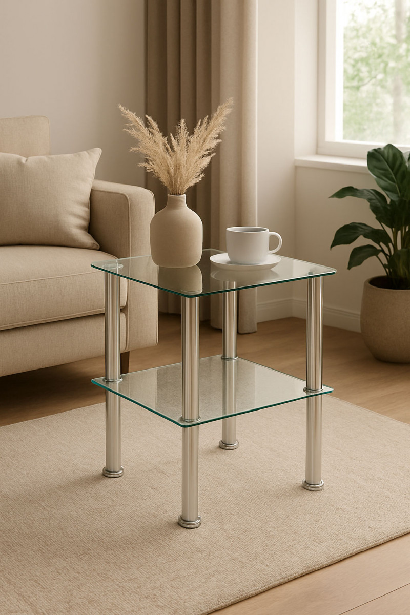Вес, кг: 6 / Высота (см): 51 / Гарантия, мес.: 12 / Глубина (см): 45 / Количество коробок: 2 / Материал каркаса: металл / Материал столешницы: стекло / Необходимость сборки: да / Раздвижной: нет / Размер упаковки 1: 0,5/0,5/0,05 / Размер упаковки 2: 0,61/0,09/0,12 / Страна производитель: Китай / Форма столешницы: квадрат / Цвет каркаса: хром / Цвет столешницы: прозрачный / Ширина (см): 45