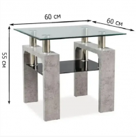 Вес, кг: 19 / Высота (см): 55 / Гарантия, мес.: 12 / Глубина (см): 60 / Количество коробок: 2 / Материал каркаса: МДФ / Материал столешницы: стекло / Необходимость сборки: да / Раздвижной: нет / Размер упаковки 1: 0,635/0,65/0,045 / Размер упаковки 2: 0,165/0,57/0,52 / Страна производитель: Китай / Форма столешницы: квадрат / Цвет каркаса: серый / Цвет столешницы: прозрачный / Ширина (см): 60