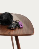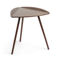 Столик Damaris от фабрики La Forma – стильный и почти невесомый, для пары чашек с кофе. Столик Damaris выглядит необыкновенно. Причина этому – треугольная столешница с загнутыми краями. Такая форма не только удивляет, но и убеждает в своей практичности. Теперь со стола ничего не укатится, да и в угол столик станет отлично. Столешница этой модели сделана из двух материалов – фанеры снизу и шпона грецкого ореха или дуба сверху (зависит от выбранной модели). Ее толщина – 1 см. Ножки выполнены из каучукового дерева. Они имеют слабо выраженную конусную форму с диаметром вверху 2,5 см, внизу – 1,8 см. Ножки расположены симметрично по отношению друг к другу и равноудаленно от центральной точки стола. Для защиты от негативных внешних воздействий они покрыты полиуретаном. Максимально допустимая нагрузка на стол не должна превышать 20 кг. Размеры: ширина – 45 см, глубина – 47 см, высота – 47 см. Вес столика составляет 1,6 кг. Потребуется небольшая сборка. Инструкция в комплекте.