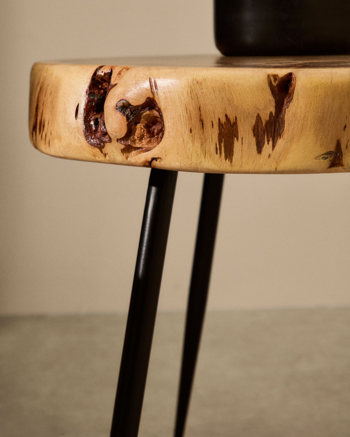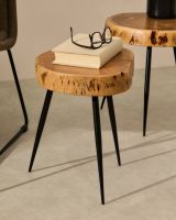 Столик Rousy CC0407M43 от фабрики La Forma – сруб акации на металлических ножках. Столик Rousy в полной мере продемонстрирует всю красоту и уникальность массива акации у вас дома. Минималистичный дизайн и поверхностная обработка древесины сделали свое дело – столик будет ярким элементов вашего интереьра. А стойкость к высоким весовым нагрузкам позволит использовать изделие и в качестве табурета. Столик круглый, состоит из трех ножек и столешницы. Столешница сделана из цельного массива акации, который покрыт лаком для защиты от влаги и загрязнений. Дерево прошло минимальную обработку, поэтому фактура отличается естественными неровностями, натуральной тональностью зерен и вершин, есть щели. Толщина столешницы составляет 6 см. Ножки сделаны из металла, который покрыт черной порошковой краской. Они имеют конусную форму с плавным сужением к низу – с 2 до 1 см. Для защиты напольного покрытия от повреждений, предусмотрены специальные наконечники. Максимально допустимая нагрузка на столик не должна превышать 80 кг. Размеры: ширина – 35 см, высота – 54 см. Вес – 8 кг. Потребуется минимальная сборка.