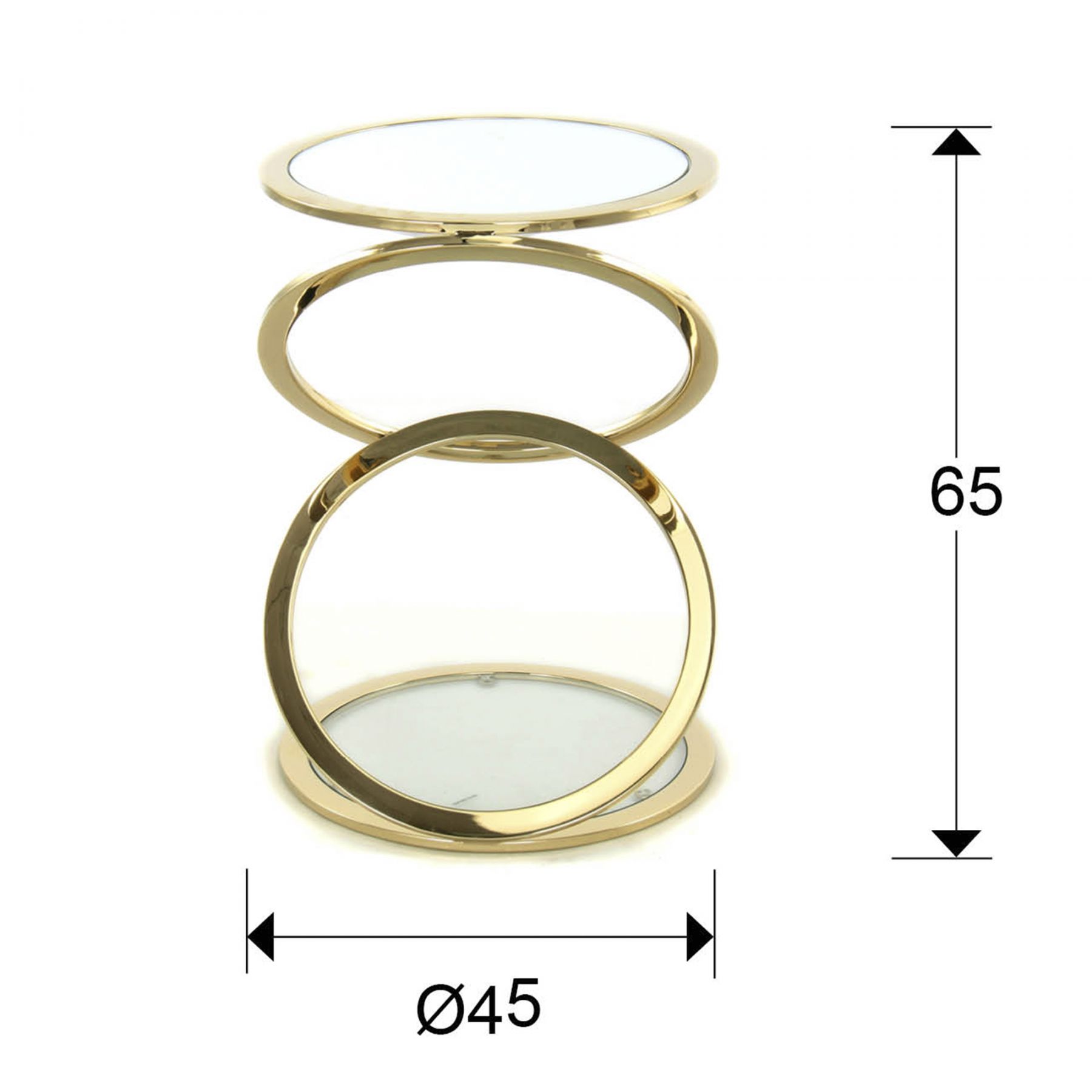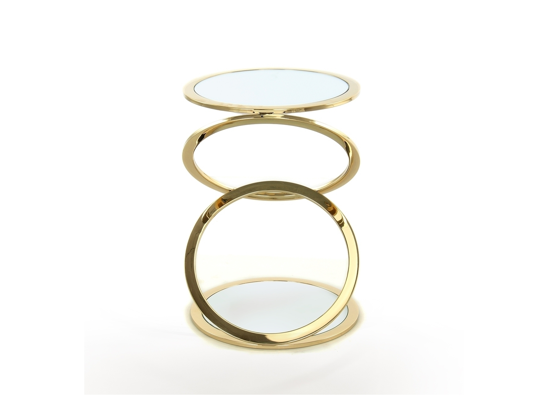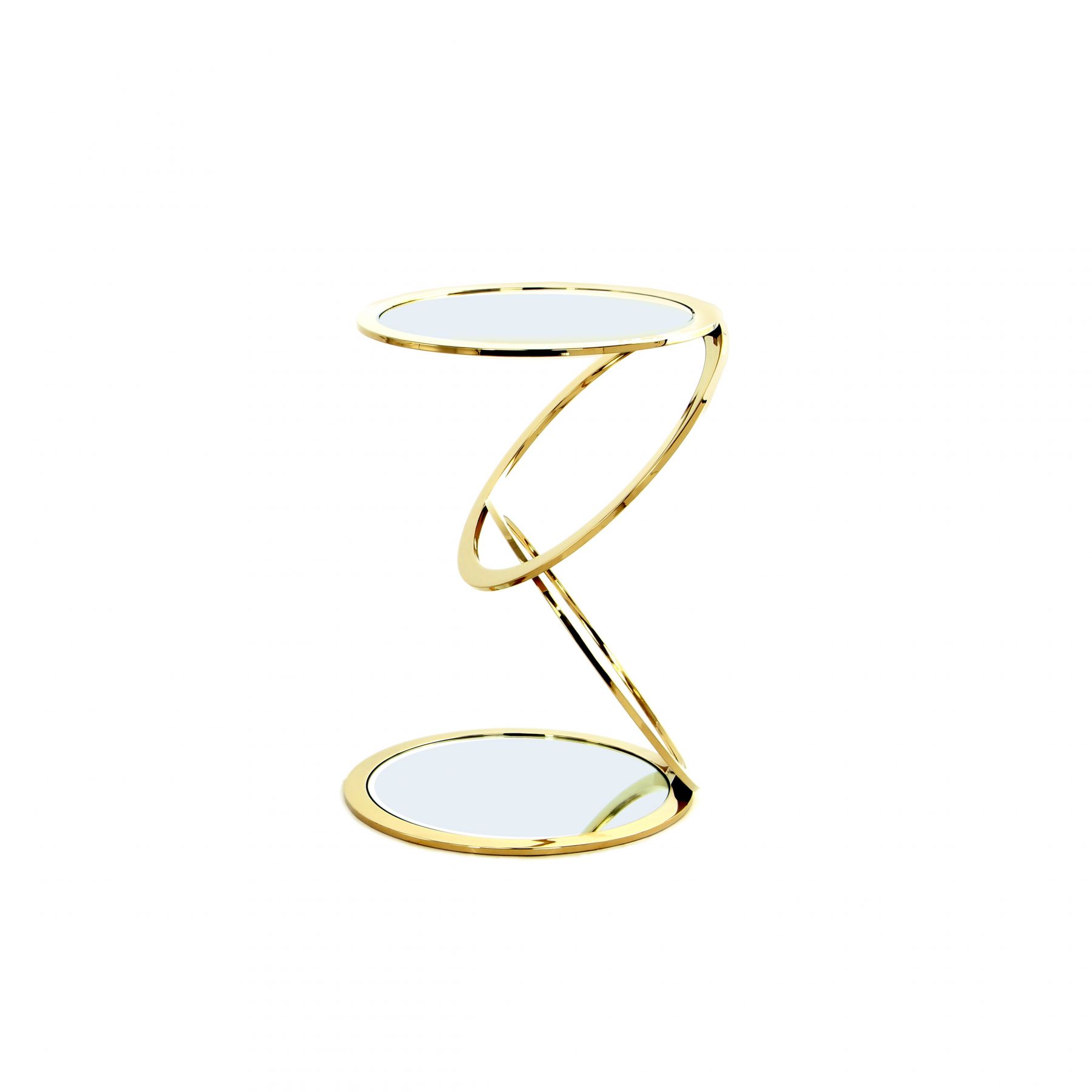 Столик придиванный круглый, из стали с глянцевым золотистым покрытием. Столешница и нижняя полка из зеркального полотна толщиной 6 мм.