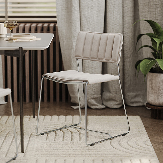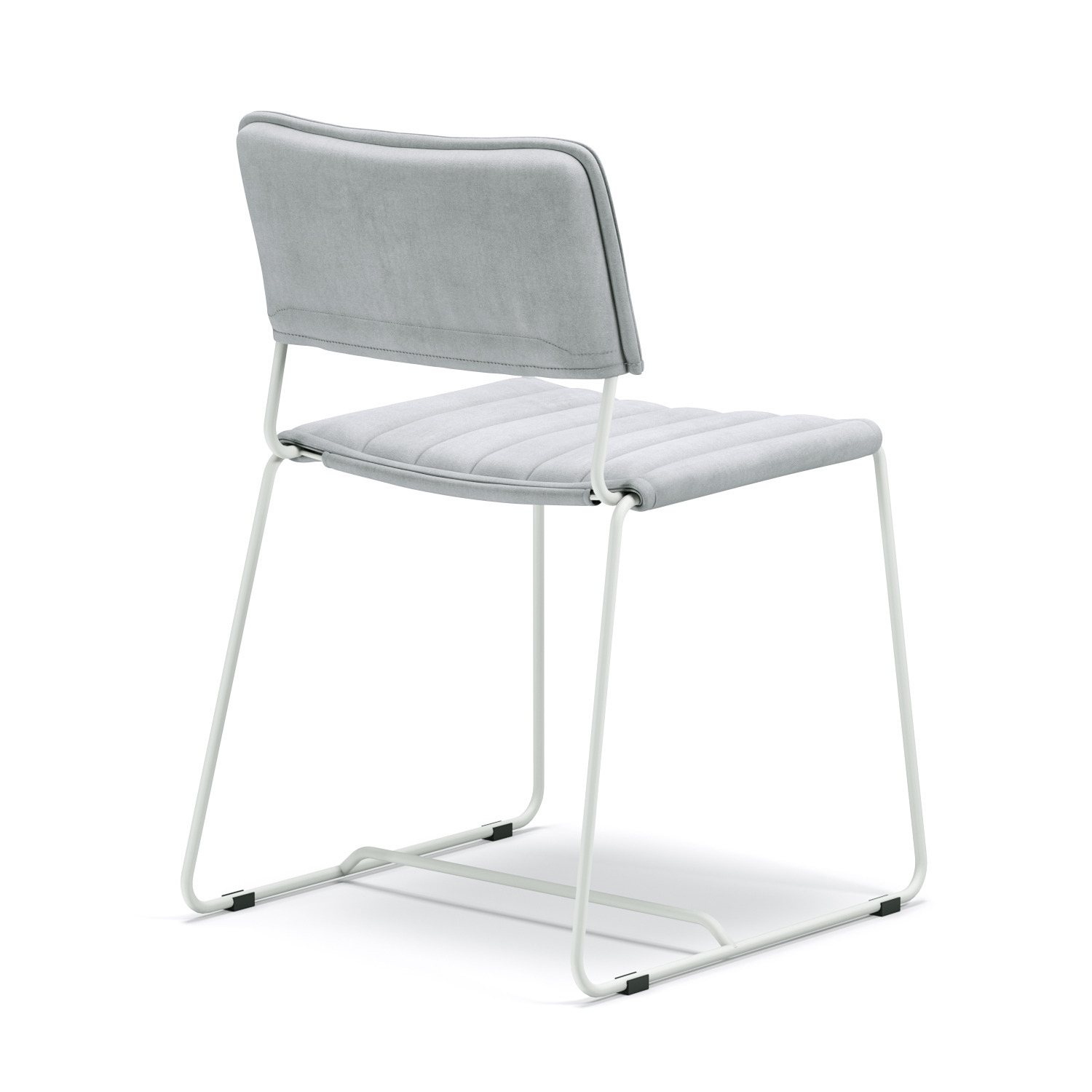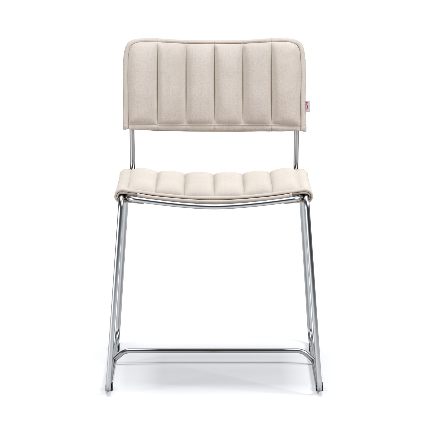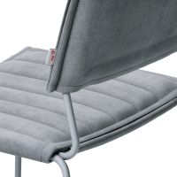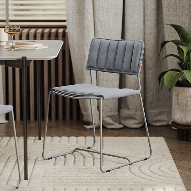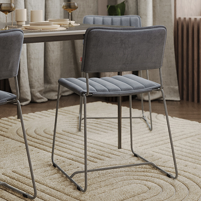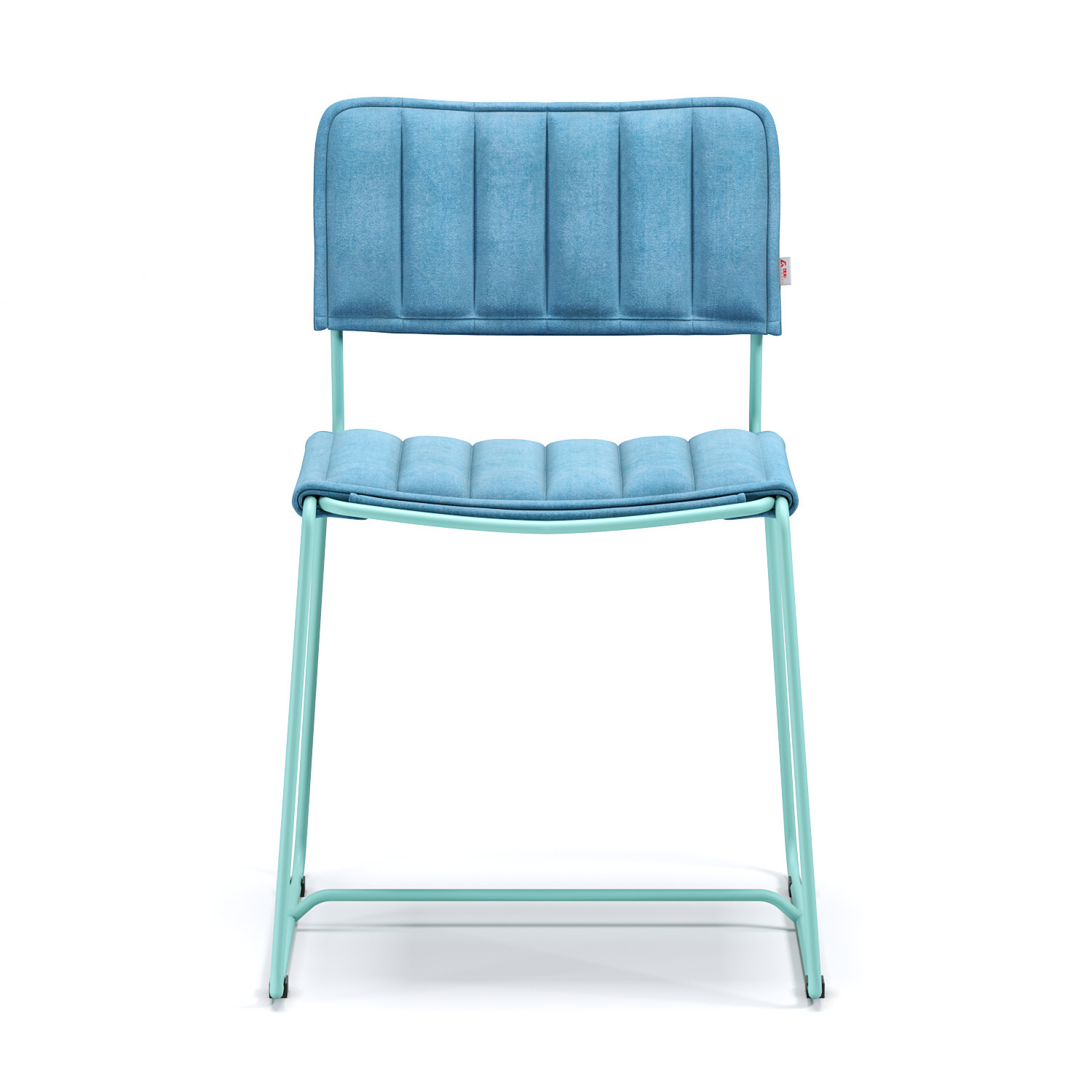 Стул на металлокаркасе. Долговечность ткани обеспечивается высокой плотностью 420 г/м.кв и стойкость к истиранию 80 000 циклов. Плотный ворс обеспечивает устойчивость ткани к проникновению влаги и загрязнения и лёгкость в уходе с помощью тряпочки из микрофибры. Варианты окраски основания: 3015 мат, 6027 мат, 7046 мат, 9003 мат, 7024 мат, бондированный хром или любой цвет из палитры RAL classic