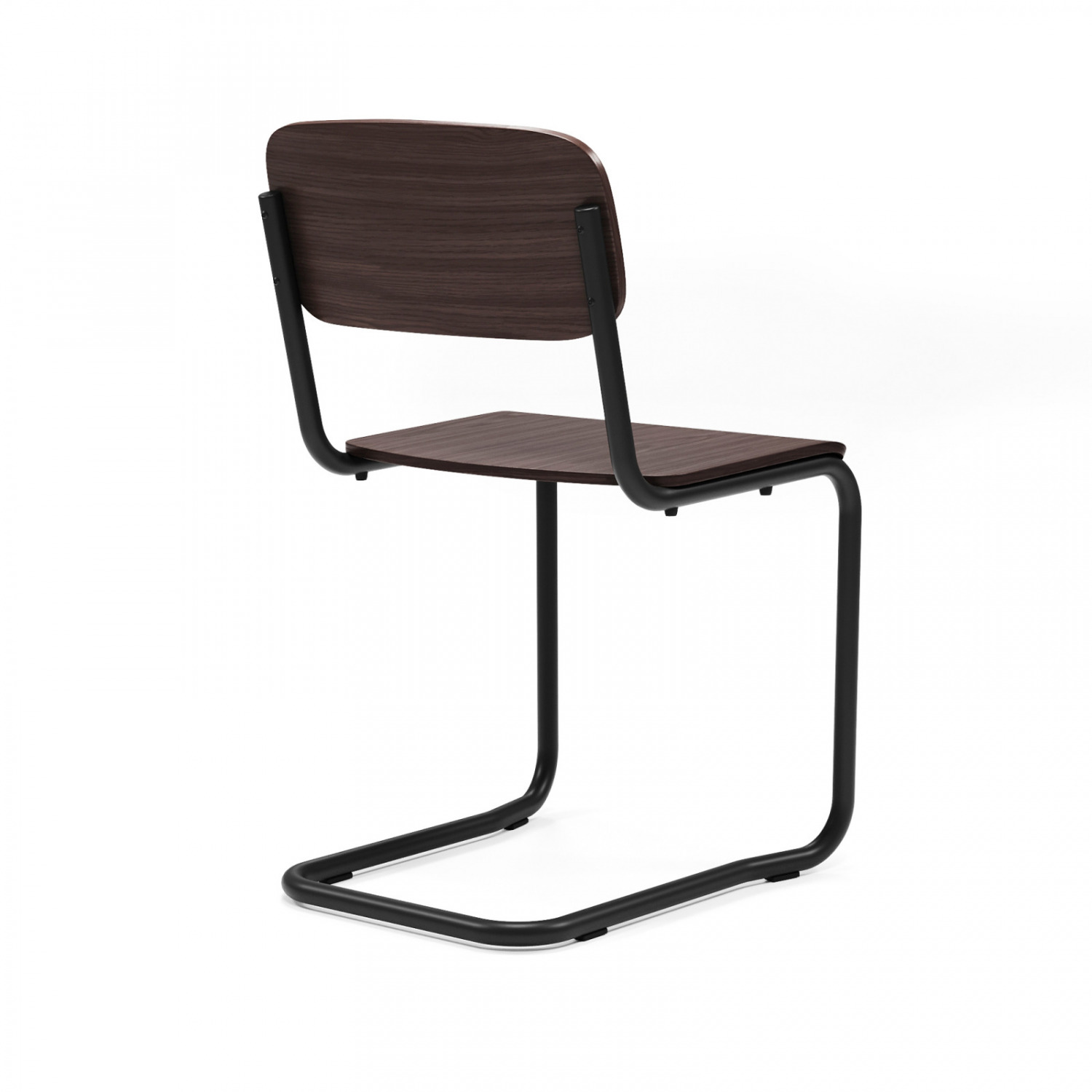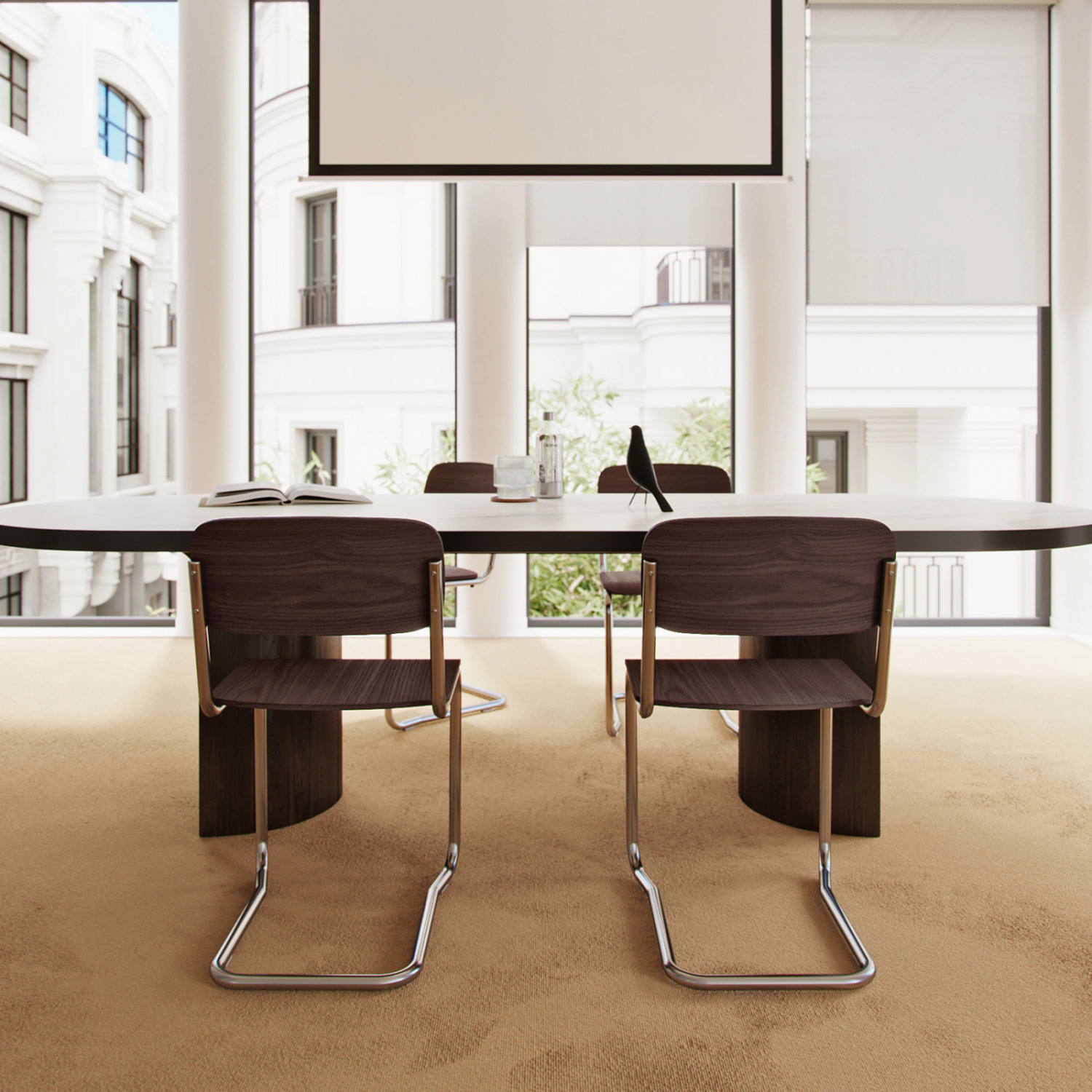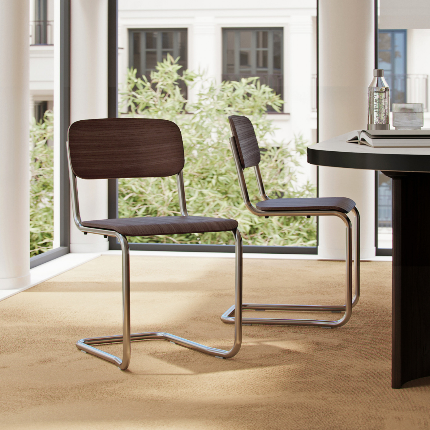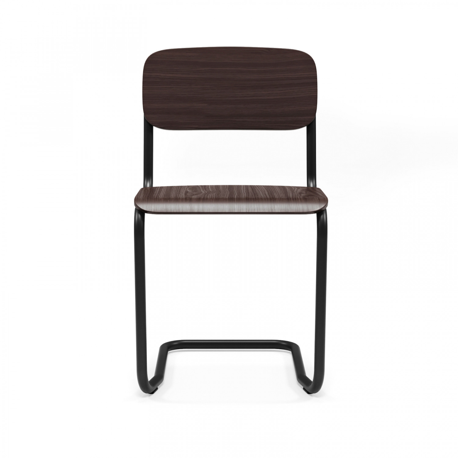 Конференц-кресло на хромированном металлокаркасе с деревянным сиденьем, покрытым шпоном натурального ясеня в цвете венге. Варианты окраски основания: гальванический хром и 9005 мат