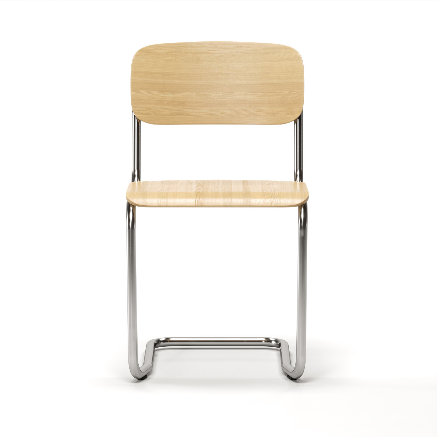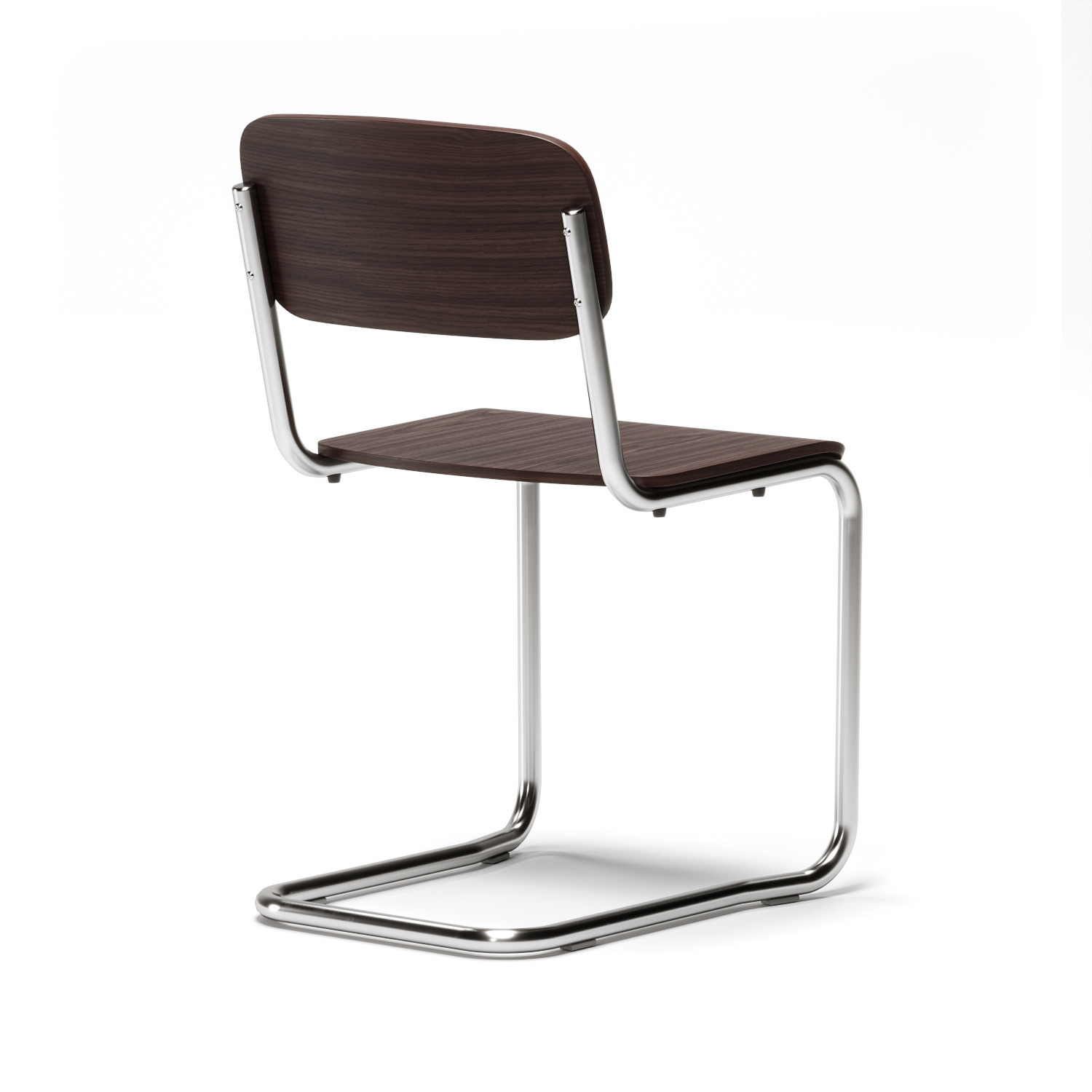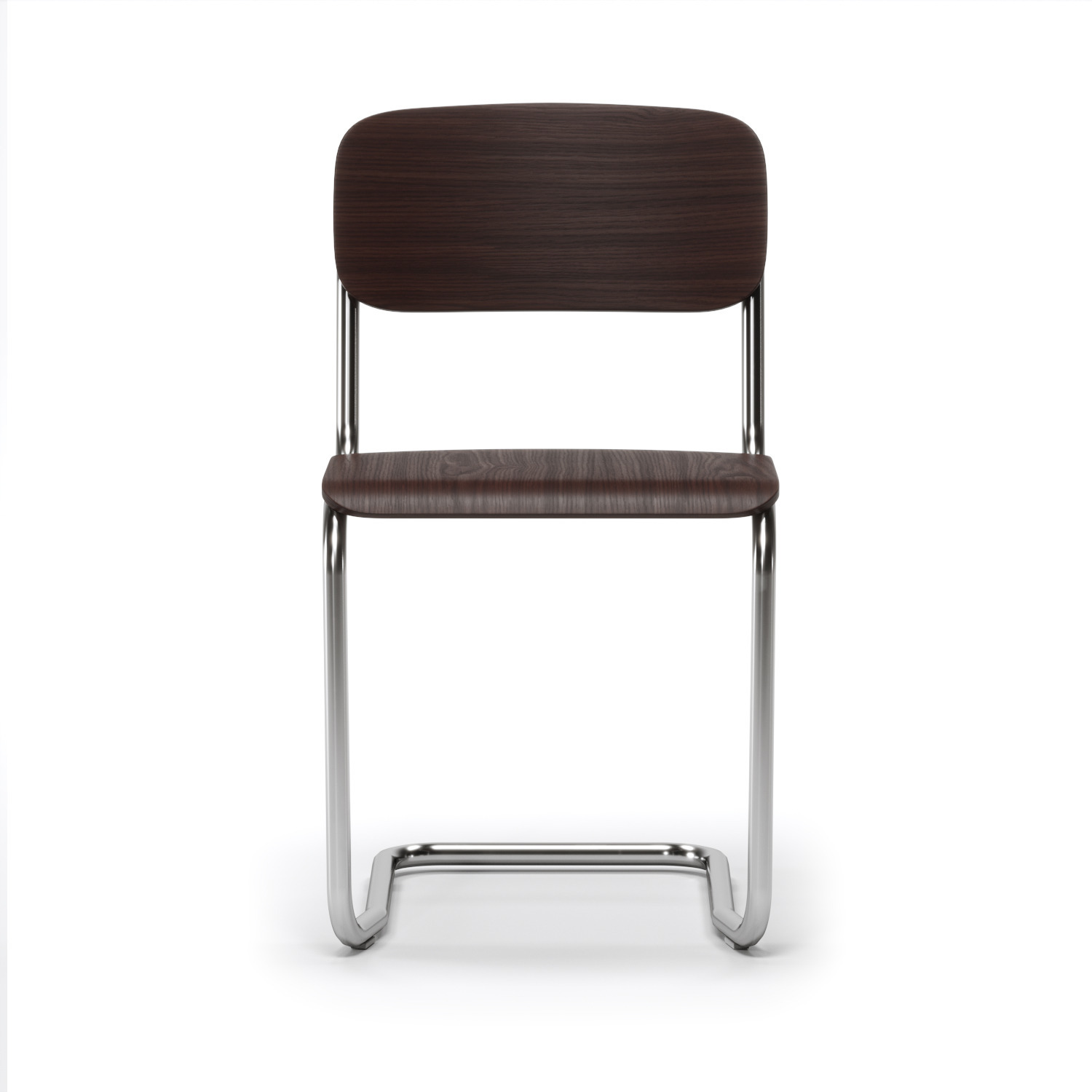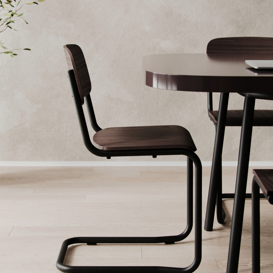 Конференц-кресло на хромированном металлокаркасе с деревянным сиденьем, покрытым шпоном натурального ясеня в цвете венге. Варианты окраски основания: гальванический хром и 9005 мат