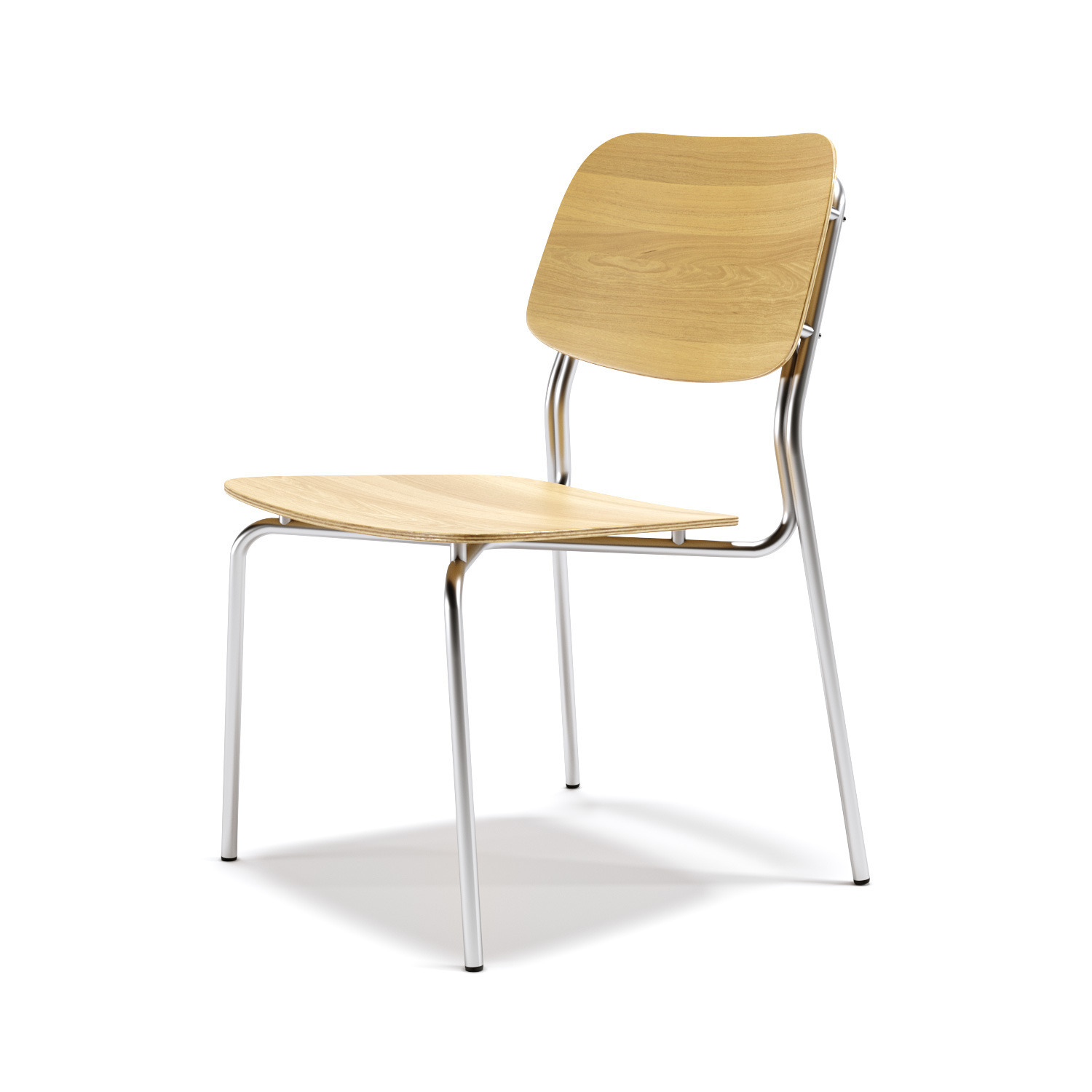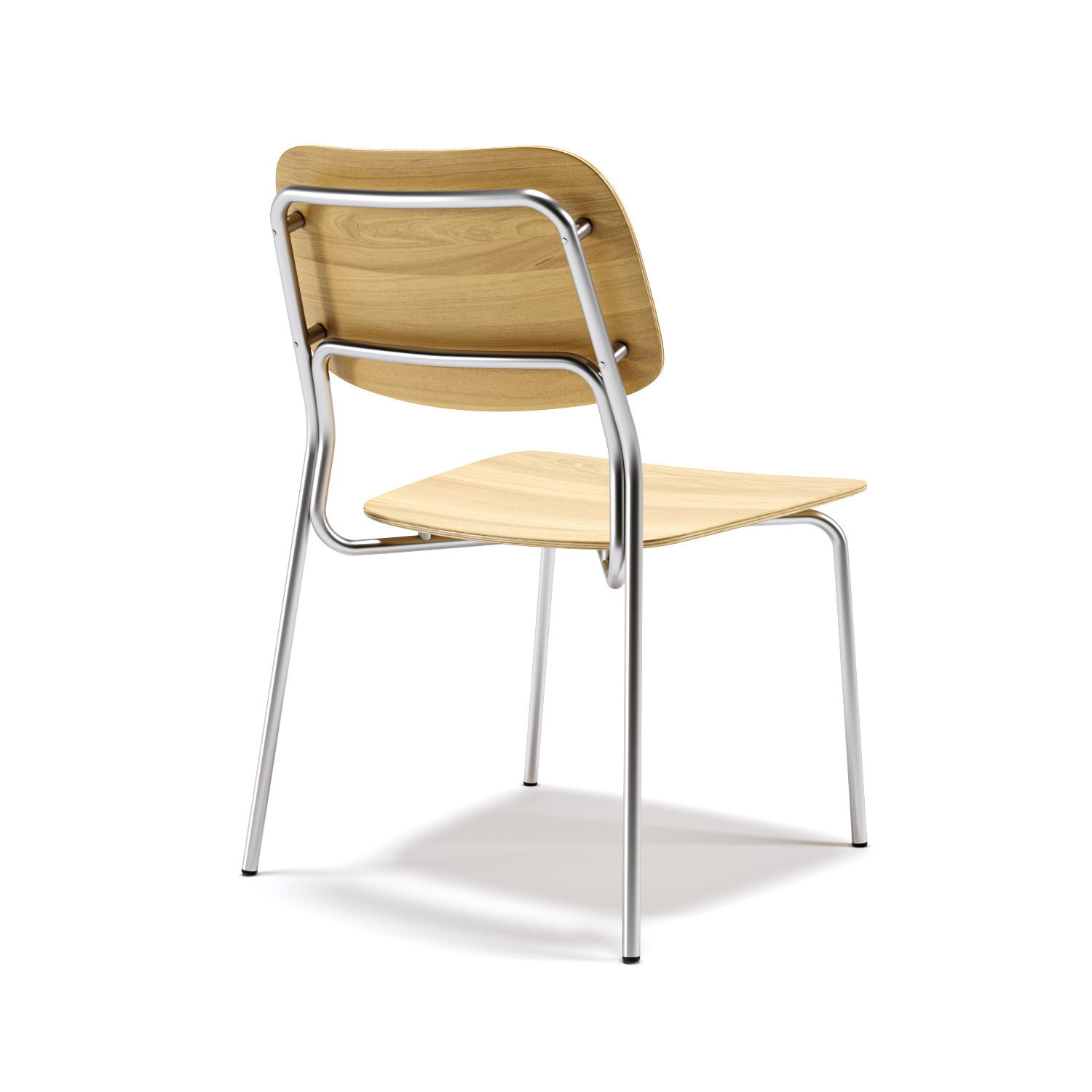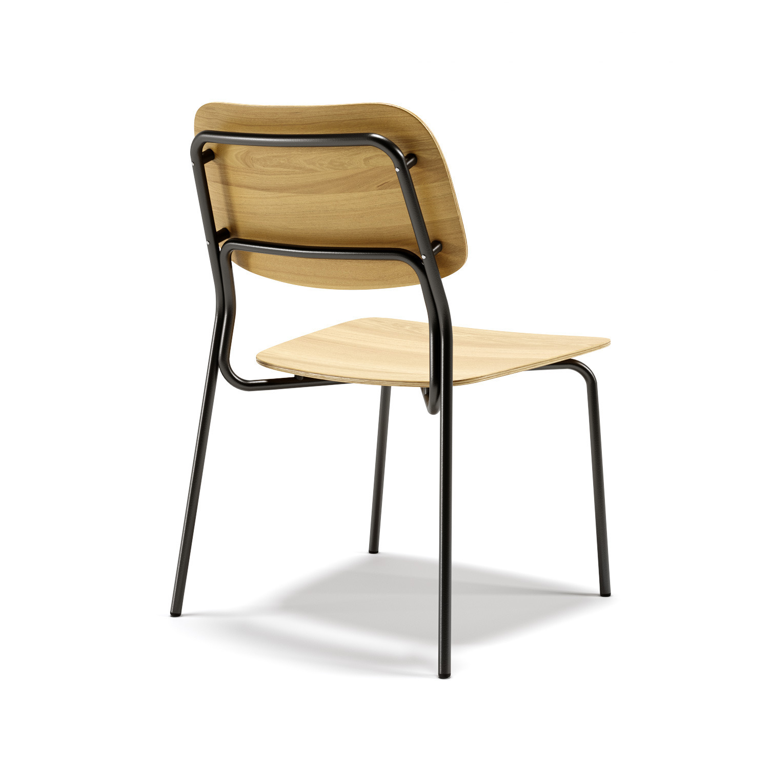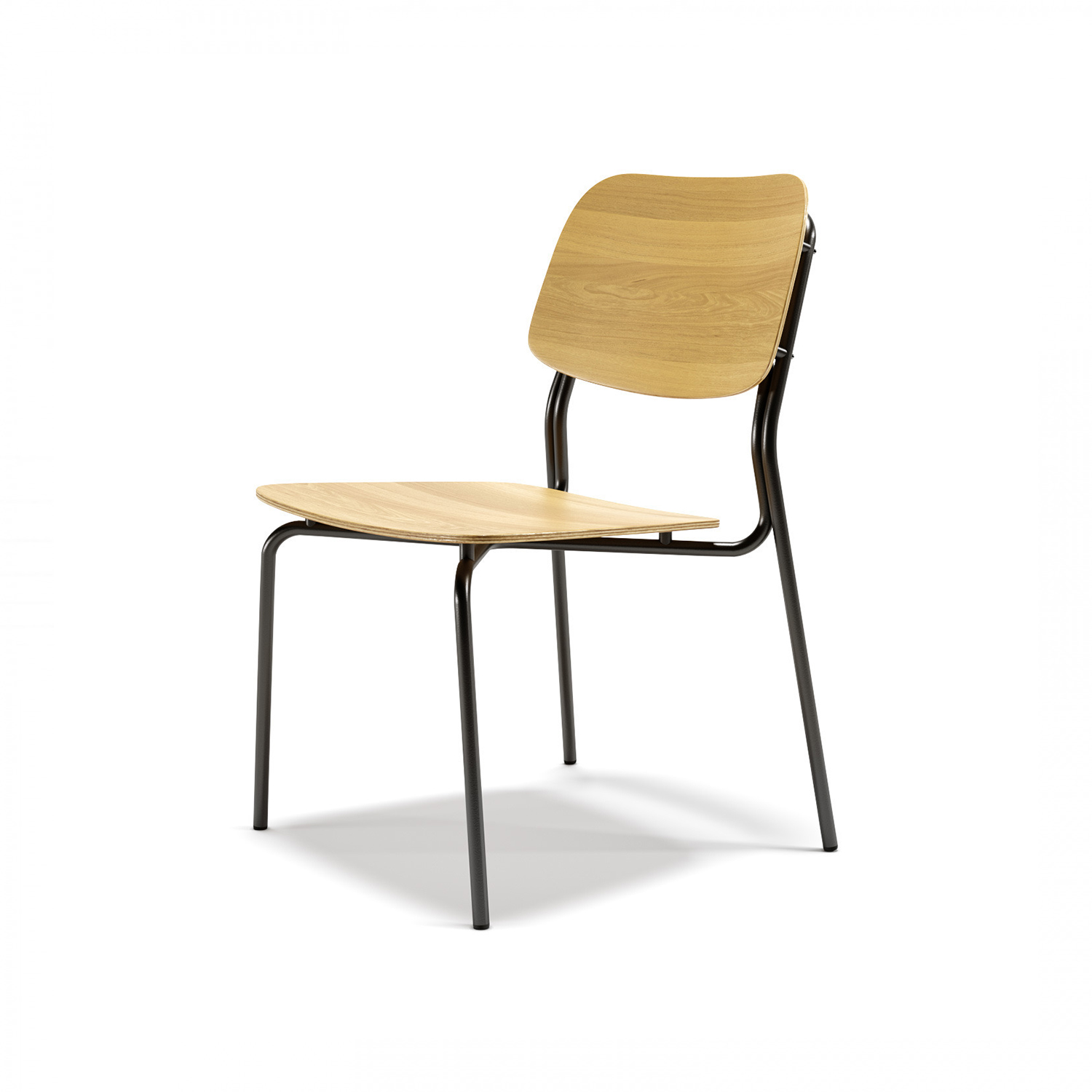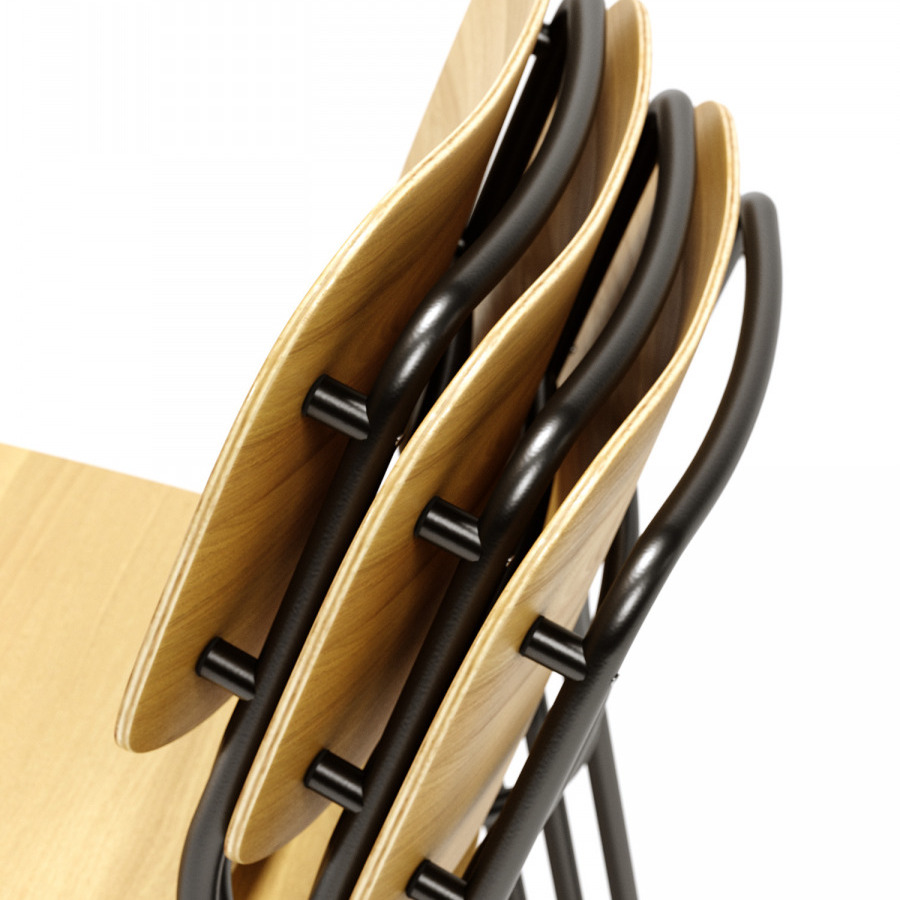 Металлический стул с сиденьем и спинкой из гнутой фанеры c покрытием из дубового шпона. Варианты окраски основания: 9005 мат и бондированный хром.