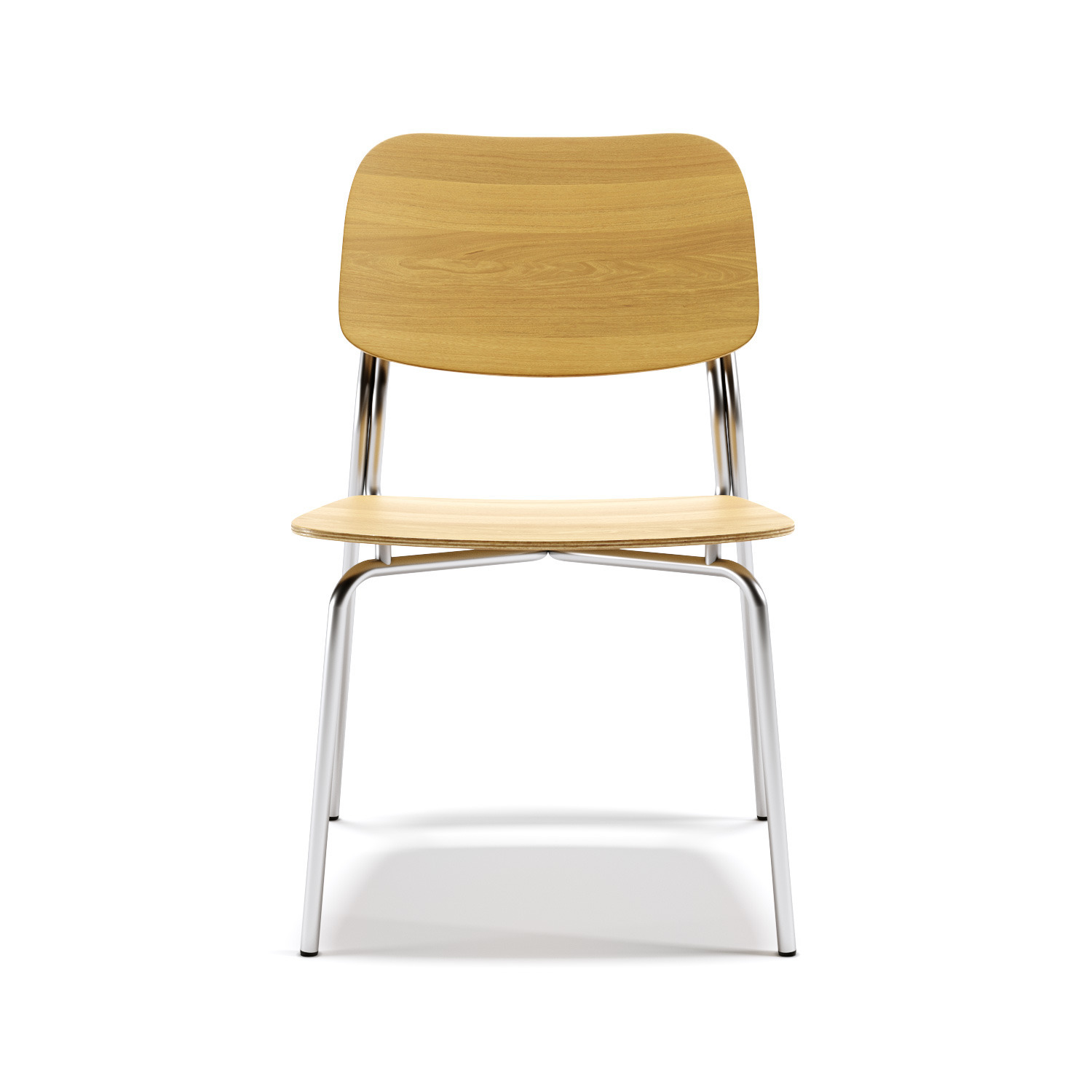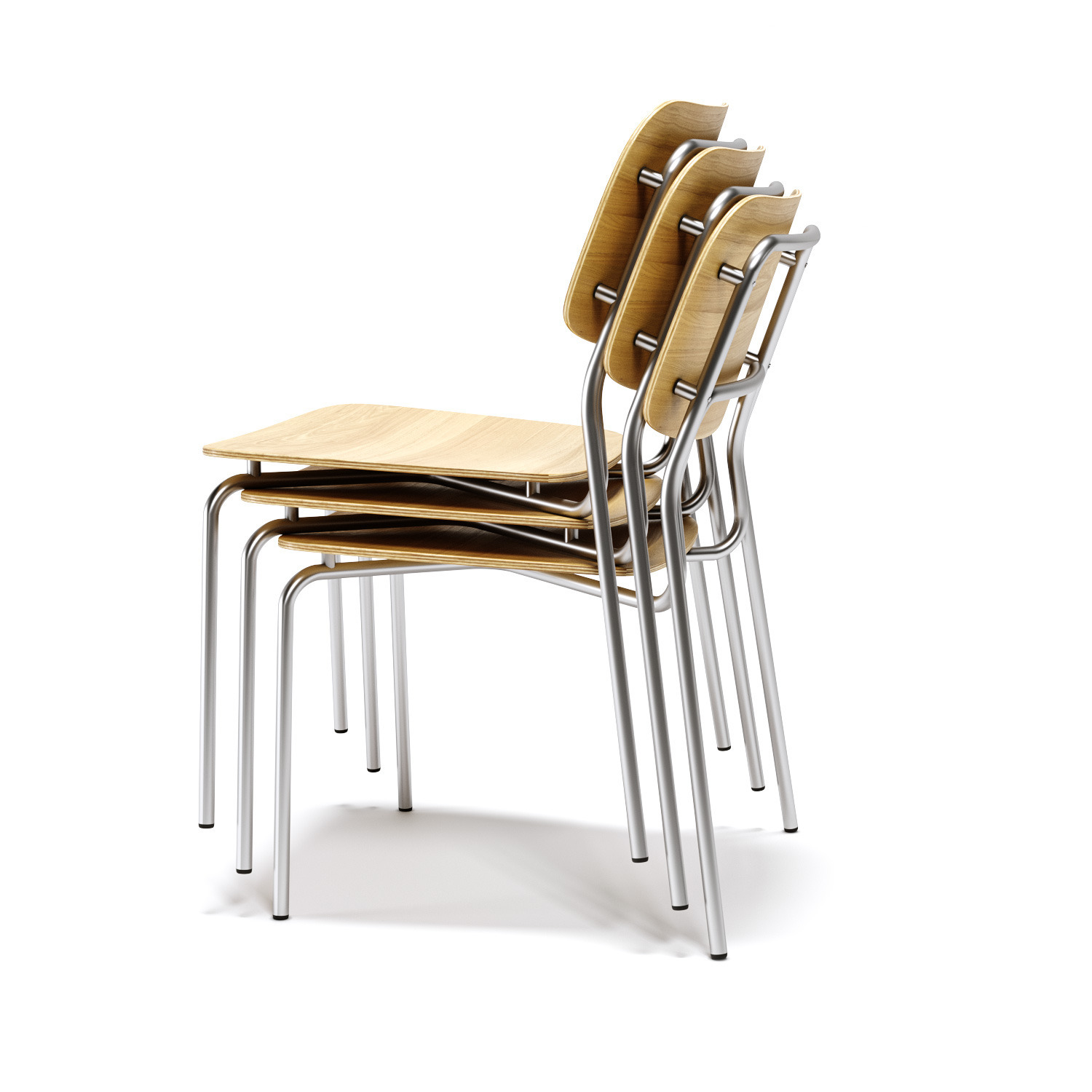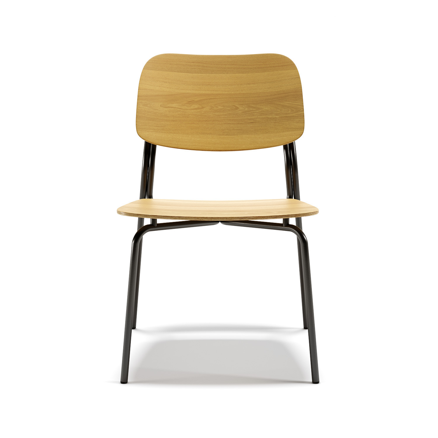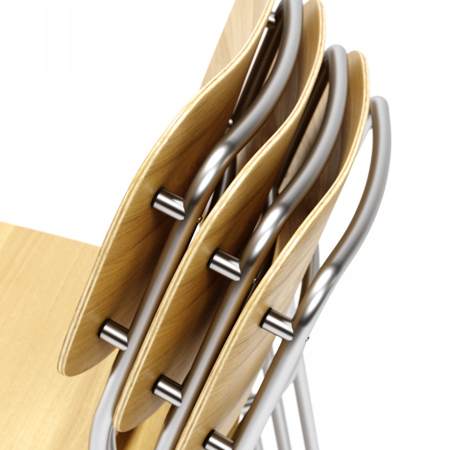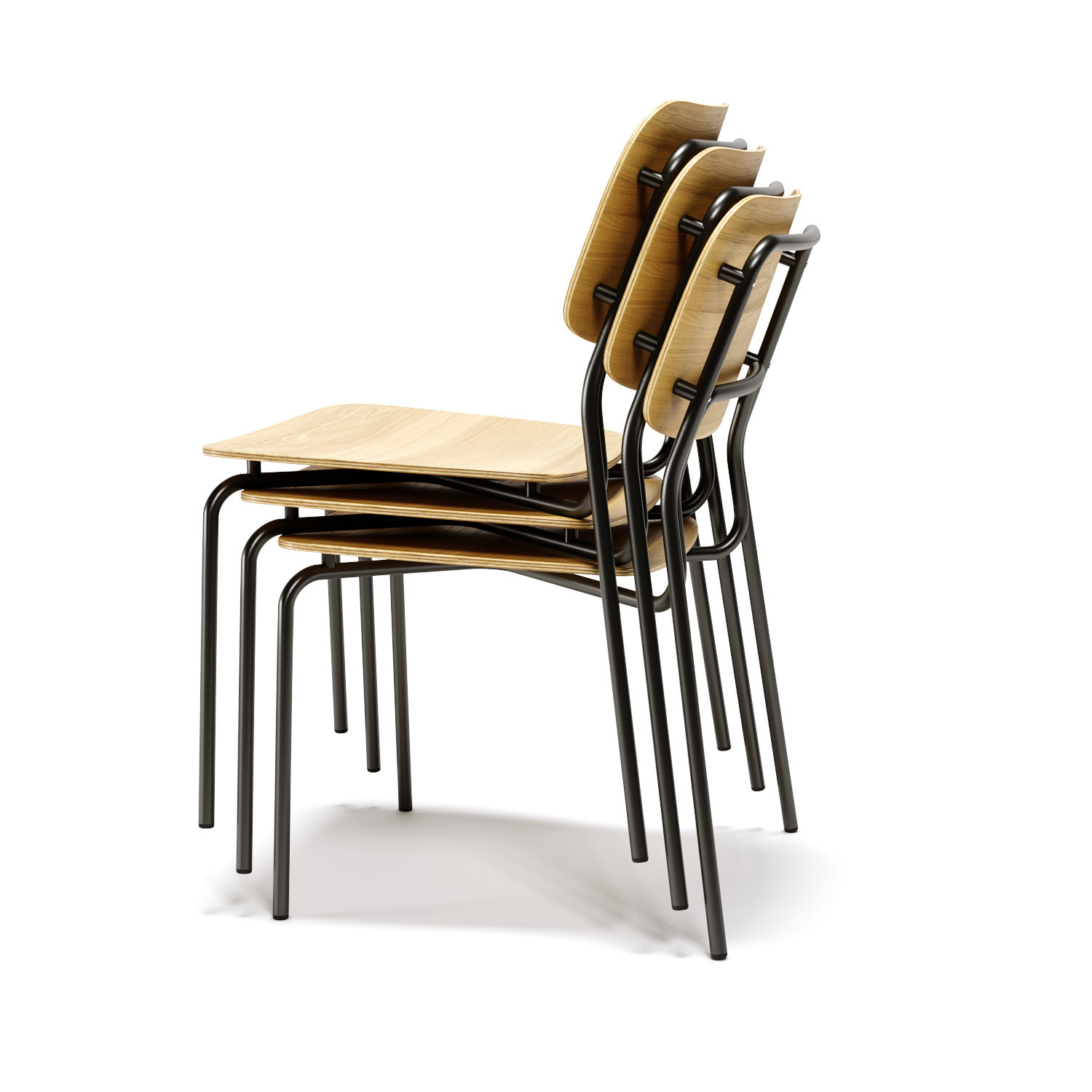 Металлический стул с сиденьем и спинкой из гнутой фанеры c покрытием из дубового шпона. Варианты окраски основания: 9005 мат и бондированный хром.