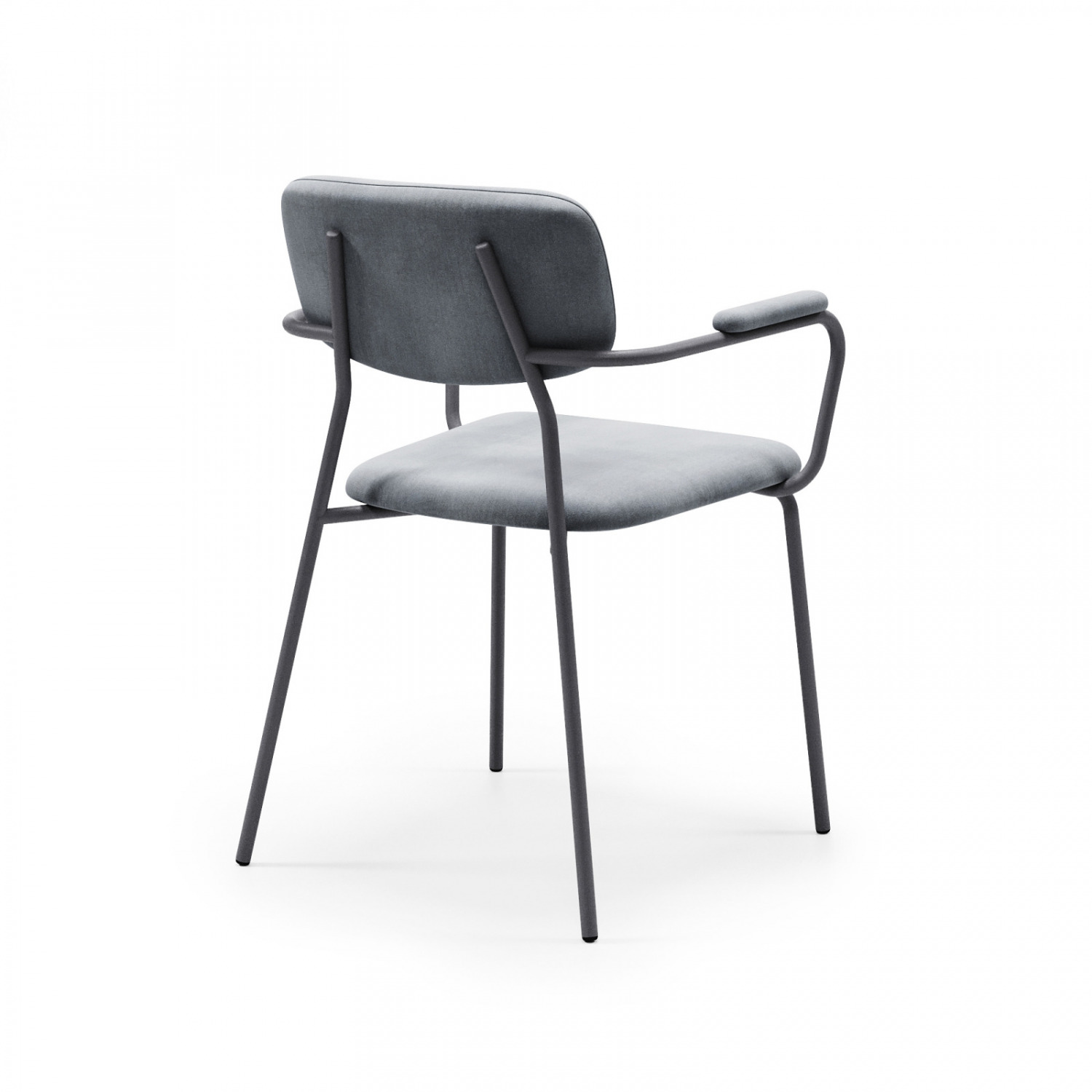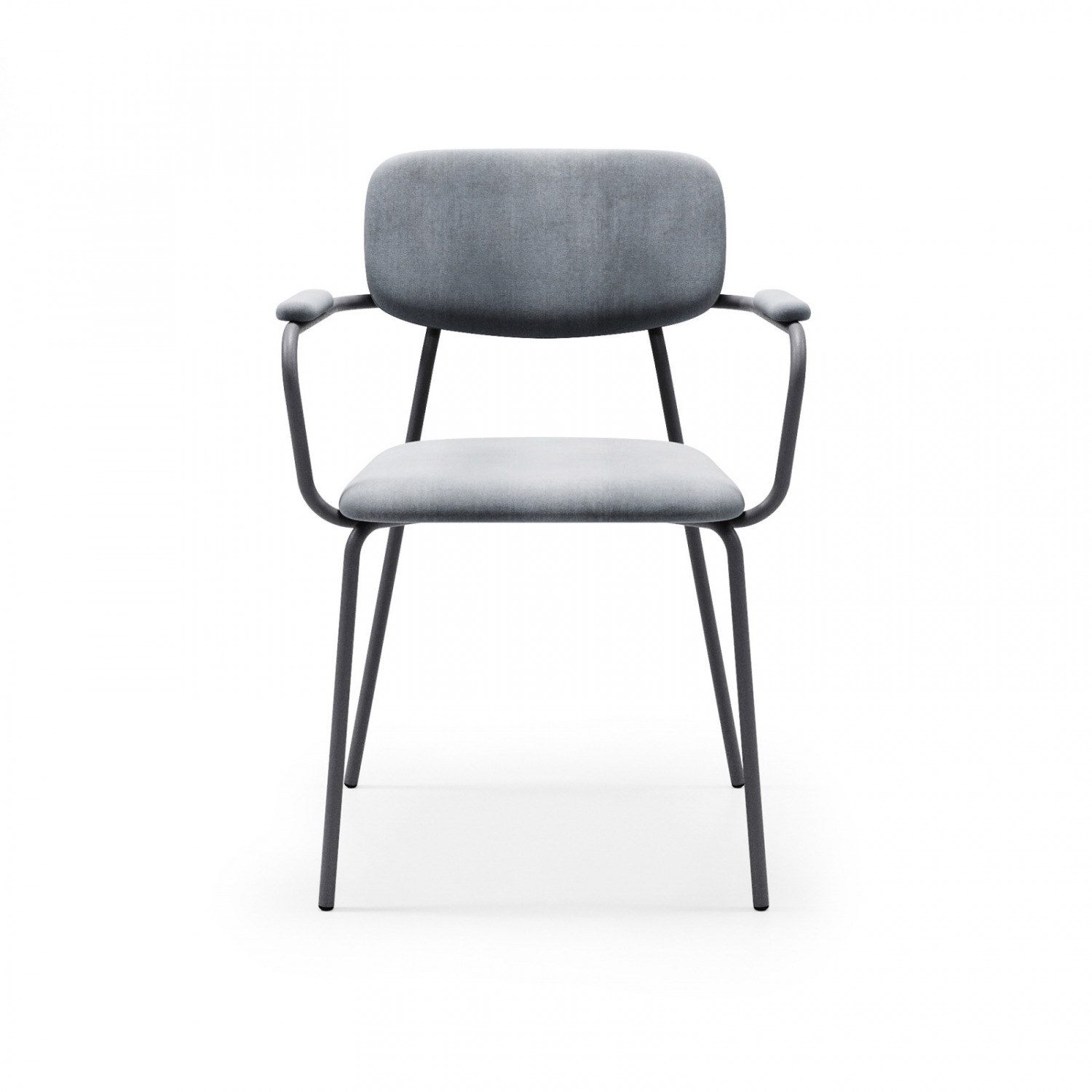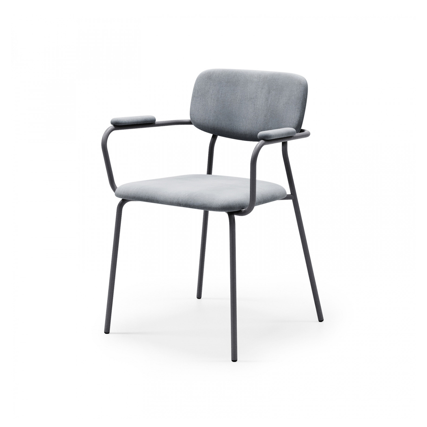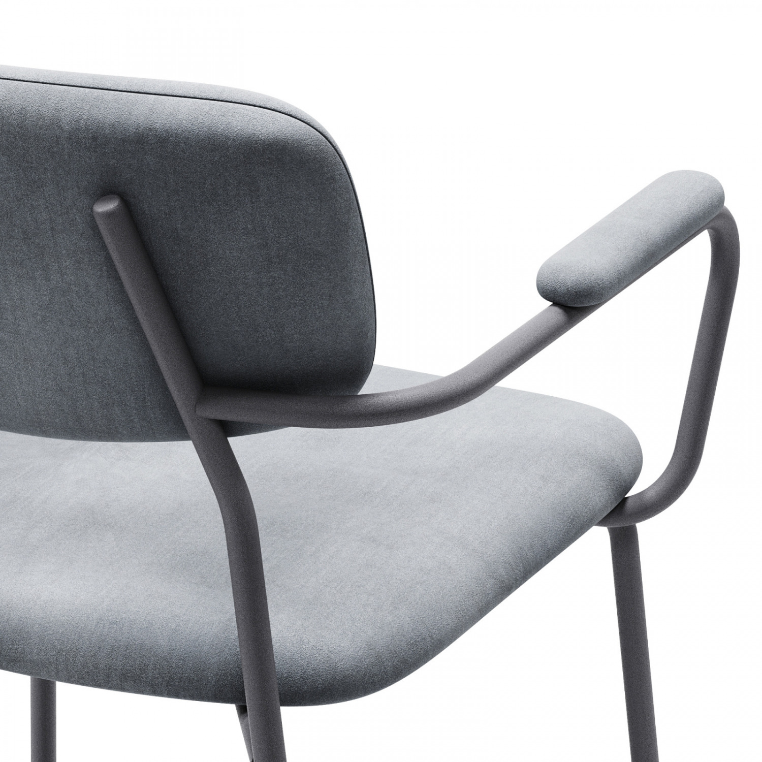 Металлический стул с сиденьем и спинкой из гнутой фанеры и подлокотниками в мягкой обивке. По желанию заказчика доступна покраска основания в любой цвет по палитре RAL classic.