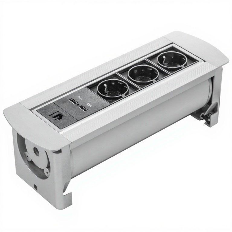 Спецификация Комплектация: Полностью в сборе: с внутренней проводкой, монтажной коробкой, проводом 2 м с вилкой Наименование FLIP Количество розеток 3 EURO, 2 USB, RJ45 Напряжение 220-250 В Максимальный ток 16 А Максимальная мощность 3500 Вт Цвет корпуса Серебристый Габаритные размеры 290х100 мм Метки товара: Поворотный розеточный блок Выдвижная розетка сертифицирована в РФ. Гарантия 2 года. Врезной блок розеток FLIP (3 EURO, 2 USB, 1 RJ45) Центральная часть переворачивается вручную, розетка оснащена 3 розетками, 2 USB и RJ45. Врезное отверстие 290х100 мм. Конструкция Удлинитель состоит из алюминиевого корпуса, встроенного блока розеток и присоединенного кабеля с вилкой. Блок FLIP включает 3 евро розетки, 2 USB и порт RJ45 Ethernet. Корпус изделия изготовлен из алюминиевого сплава, отличается высокой прочностью и надежностью, имеет привлекательный внешний вид, не стареет со временем. Благодаря устойчивости к высоким температурам, коррозии, ультрафиолетовым лучам, он обеспечит ручному удлинителю длительный срок службы. Установка Удлинитель на 3 евро розетки, 2 USB и порт RJ45 Ethernet FLIP монтируется посредством установки в вырез на горизонтальной деревянной поверхности. Плоские, ровные выступы по периметру изделия плотно прилегают к основанию, обеспечивают эстетичный внешний вид.