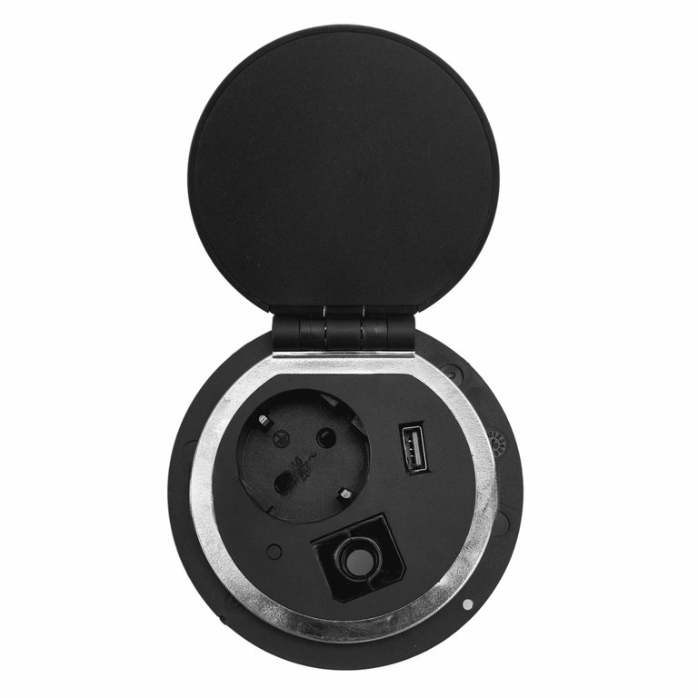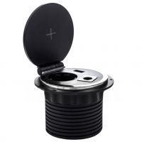 Спецификация Наименование SET BLACK Количество розеток 1 розетка, 1 USB, беспроводная зарядка, пропуск под кабель/информационный USB Максимальный ток 16 А Максимальная мощность 3500 Вт Цвет корпуса Чёрный Глубина 90 мм Врезное отверстие Диаметр — 80 мм Выдвижная розетка сертифицирована в РФ. Гарантия 2 года. Выдвижная розетка SET BLACK (чёрная, 1 розетку, 1 USB, беспроводную зарядку, пропуск под кабель/информационный USB) Розетка оснащена беспроводной зарядкой, розеткой евро стандарта с заземлением, 1 USB разъем (зарядка) и пропуском под кабель, который можно заменить информационным USB разъемом (идёт в комплекте).