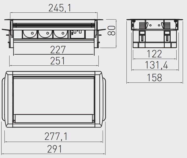 Спецификация Комплектация: Полностью в сборе: с внутренней проводкой, проводом 2 метра с вилкой, без корпуса (для выводов проводов) Производитель GTV AE-PBC3GS2U-53BKS Страна Польша Количество розеток 3 EURO + 2 USB Напряжение 200-250 В Максимальный ток 16 А Максимальная мощность 3600 Вт Цвет корпуса Серебристый Габаритный размер 26,5х15,8х80 см Врезное отверстие 24,5х13 см USB 5V, 2.1A Выдвижная розетка сертифицирована в РФ. Гарантия 2 года. Встраиваемая выдвижная розетка GTV AE-PBC3GS2U-53BKS с пропуском под кабель (на 3 розетки, 2 USB) Тонкий корпус, в закрытом состоянии розетка образует ровную поверхность со столешницей. Даже в закрытом состоянии нет необходимости выключать электроприборы из розетки, т.к. на ее корпусе установлена специальная щетка, через которую выходят провода подключаемых электроприборов. Данная модель готова к эксплуатации вся внутренняя разводка уже сделана на заводе, в комплекте с сетевым шнуром длиной 1,5 м, необходимо только подключить изделие к розетки. Комплект поставки так же входит инструкция по установке изделия в столешницу, с подробной схемой и указанием всех размеров. Сфера применения: Выдвижные розетки отлично подходят для установки в столешницу на кухне, что помогает экономить рабочее пространство. В закрытом положении встраиваемая розетка образует со столешницей практически ровную поверхность. Также выдвижные розетки нашли распространение в офисах, переговорный залах, стойках обслуживания клиентов.