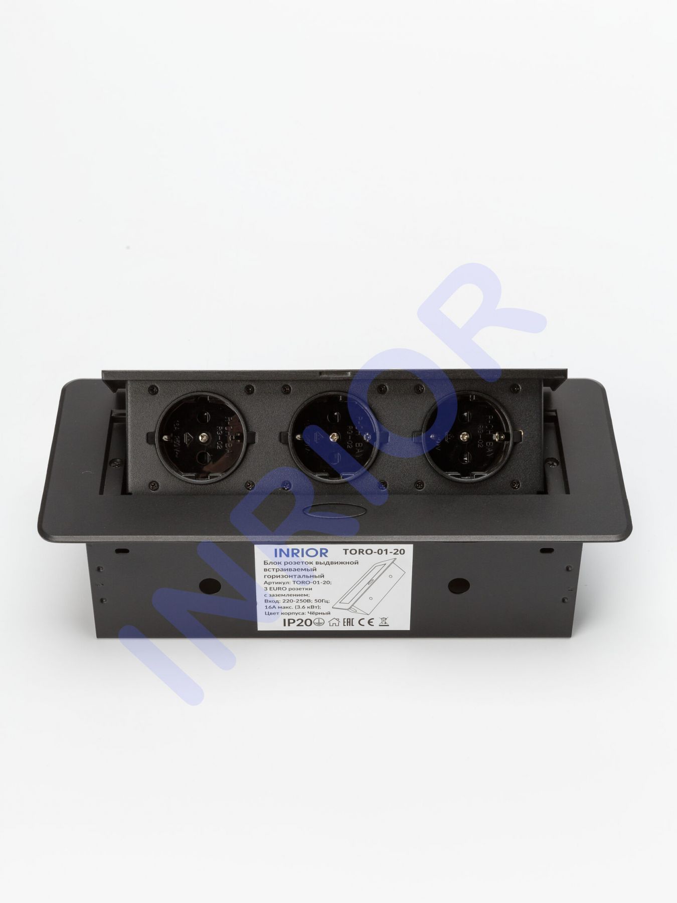 Спецификация Комплектация: монтажная коробка Наименование INRIOR TORO-01-20 BLACK Количество розеток 3 EURO Напряжение 200-250 В Максимальный ток 16 А Максимальная мощность 3600 Вт Цвет корпуса Черный Габаритный размер 265?118?65 мм Врезное отверстие 225х108 мм Материал: Корпус, верхняя рамка, установочная коробка из металла Метки товара: Выдвижные розетки для кухни, мебели, рабочих зон Выдвижная розетка сертифицирована в РФ. Гарантия 2 года. Выдвижная розетка INRIOR TORO-01-20 BLACK (чёрная, на 3 розетки) Выдвижная горизонтальная розетка, представляет собой металлический прямоугольный розеточный блок INRIOR TORO-01-20 на 3 EURO розетки. Аналог: Etersso 267J. При нажатии на кнопку на лицевой части розетки, происходит плавное открытие. Качественная порошковая окраска корпуса позволяет долгое время сохранить внешний вид нового изделия, розетка не царапается. Комплект поставки так же входит инструкция по установке изделия в столешницу, с подробной схемой и указанием всех размеров. Сфера применения: Выдвижные розетки отлично подходят для установки в столешницу на кухне, что помогает экономить рабочее пространство. В закрытом положении встраиваемая розетка образует со столешницей практически ровную поверхность. Также выдвижные розетки нашли распространение в офисах, переговорный залах, стойках обслуживания клиентов.