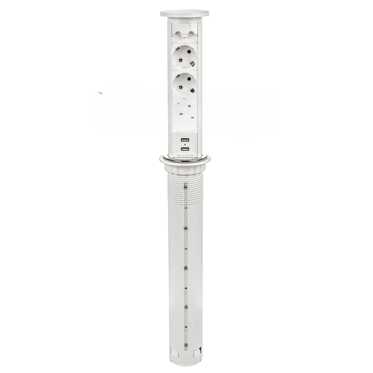 Выдвижная розетка MAGNUM+ с электроприводом (на 3 EURO розетки, 2 USB) Технические характеристики Сенсорный блок имеет следующие характеристики: Напряжение: 95В-250В; Сила тока для розеток / USB: 16 А/1А Частота: 50 Гц / 60 Гц; Диаметр: 60 мм. Автоматическая модель нового поколения, аккуратная и компактная. Открывается и закрывается нажатием на крышку. Форма крышки спроектирована так, чтобы исключить попадания влаги в автоматический механизм. Выдвижной удлинитель на 3 EURO розетки + 2 USB разъема. Отличительной особенностью данного выдвижного блока является: выдвижной механизм открытия с помощью электропривода, после нажатия на крышку розетка плавно выезжает самостоятельно. Данная модель готова к эксплуатации вся внутренняя разводка уже сделана на заводе, в комплекте с сетевым шнуром длиной 2 м, необходимо только подключить изделие к розетки.