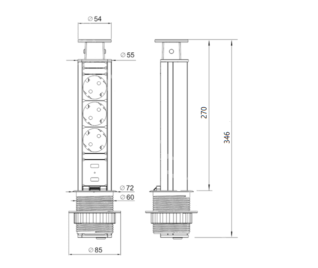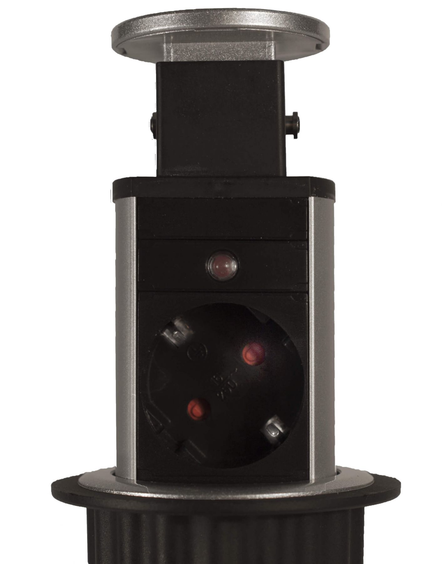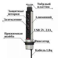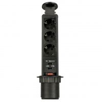 Спецификация Наименование INRIOR RUFH-03-80 GRAY Количество розеток 3 EURO + 2 USB Напряжение 200-250 В Максимальный ток 16 А Максимальная мощность 3600 Вт Цвет корпуса Серебристый USB 5V, 2.1A Врезное отверстие Диаметр — 60 мм Выдвижная розетка сертифицирована в РФ. Гарантия 2 года. Данная модель не подходит для установки в навесные шкафы. Выдвижная розетка INRIOR RUFH-03-80 GRAY (на 3 розетки, 2 USB) Вертикальная выдвижная розетка на 3 EURO розетки и 2 USB порта. Аналог: Etersso GN10503S. Выдвижная розетка INRIOR RUFH-03-80 на 3 EURO розетки и 2 USB разъема, цвет серебристый, основание корпуса изготовлено из алюминия, торцевая часть розетки и корпус, из соображений безопасности выполнен из прочного пластика. Качественная порошковая окраска корпуса позволяет долгое время сохранить внешний вид нового изделия, розетка не царапается. Механизм розетки выполнен по технологии POP-UP. В закрытом состоянии розетка образует практически ровную поверхность со столешницей. Для открытия нажмите на «пятачок» он поднимется, потяните розетку в верх до ее фиксации — розетка готова к работе. Данная модель готова к эксплуатации вся внутренняя разводка уже сделана на заводе, в комплекте с сетевым шнуром длиной 1.8 м, необходимо только подключить изделие к розетке. Комплект поставки так же входит инструкция по установке изделия в столешницу, с подробной схемой и указанием всех размеров. Сфера применения: Выдвижные розетки отлично подходят для установки в столешницу на кухне, что помогает экономить рабочее пространство. В закрытом положении встраиваемая розетка образует со столешницей практически ровную поверхность. Также выдвижные розетки нашли распространение в офисах, переговорных залах, стойках обслуживания клиентов.
