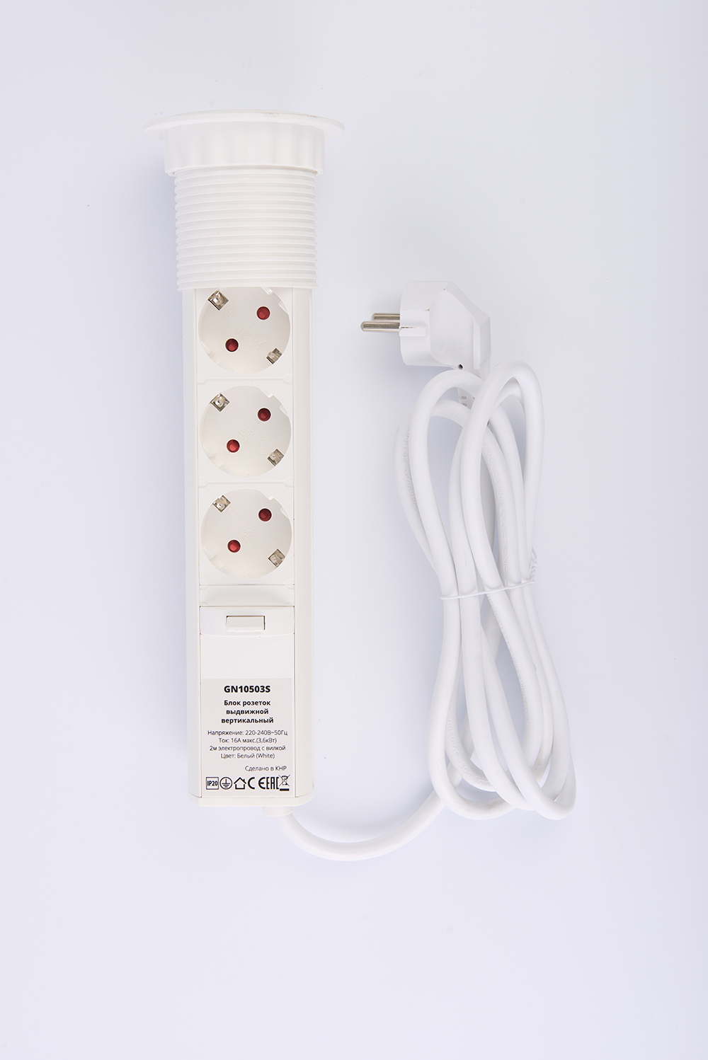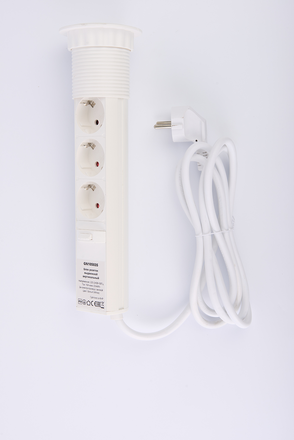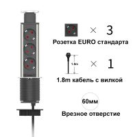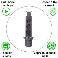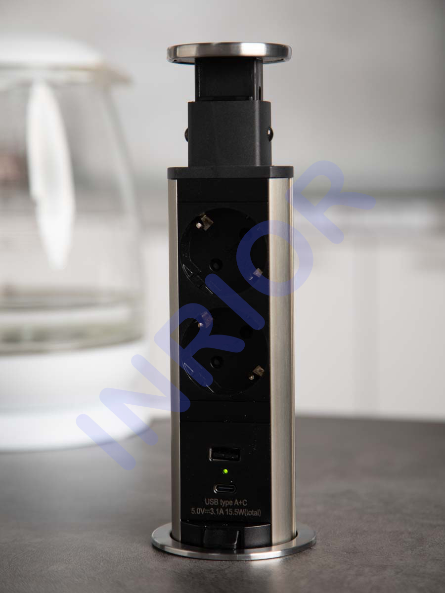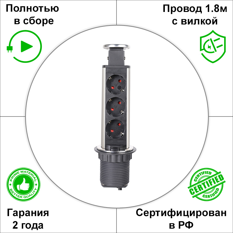 Спецификация Выдвижная розетка сертифицирована в РФ. Гарантия 2 года. Наименование: INRIOR RUFH-90 Количество розеток: 3 EURO с заземлением Напряжение: 220-240 В ~50 Гц Максимальный ток: 16 А Максимальная мощность: 3600 Вт Цвет корпуса: Нержавеющая сталь Врезное отверстие Диаметр — 60 мм Данная модель не подходит для установки в навесные шкафы. Встраиваемая выдвижная розетка для столешницы, INRIOR RUFH-90. Основной особенностью данной модели является премиальный корпус. Корпус розетки изготовлен полностью из нержавеющей стали. Цвет нержавеющая сталь. Врезной диаметр 60 мм. Данная модель предназначена для кухонных столешниц и офисных столов, ее нельзя устанавливать "вверх ногами" в навесные шкафы. Механизм работает корректно, без заеданий, не болтается в посадочной площадке. Поднимается и убирается вручную. В выдвижном удлинителе INRIOR RUFH-90, на всех розетках установлены защитные шторки, розетка выполнена с заземлением. Розетка полностью готова к работе и идет в комплекте уже с кабелем длиной 1,8 метра, с вилкой, сечение провода 3х1,5 мм. Мощность 16А, 3600 Вт. Максимальная толщина столешницы для установки 45-50 мм. Аналог: Etersso GN10503S. Комплектация Розетка INRIOR RUFH-90 Индивидуальная упаковка Инструкция по установке и эксплуатации